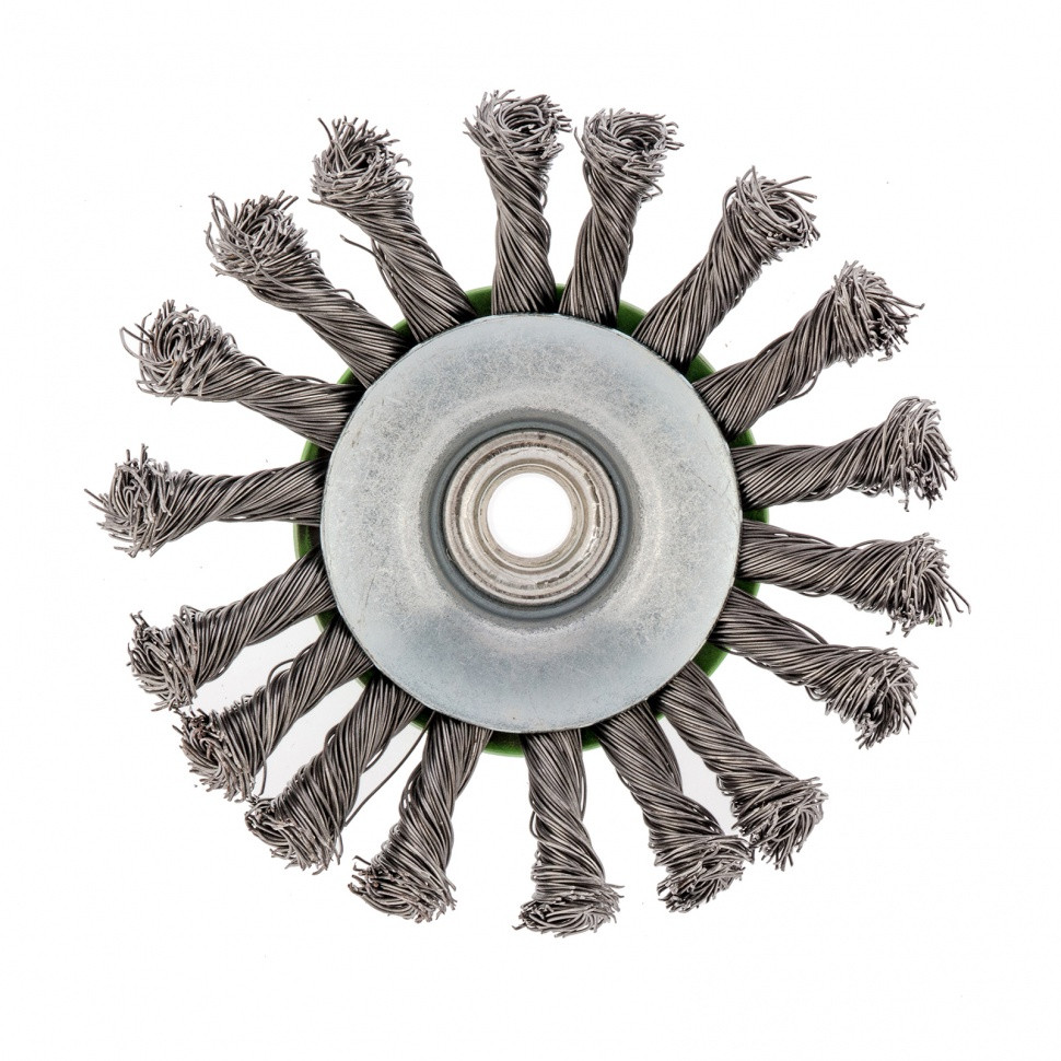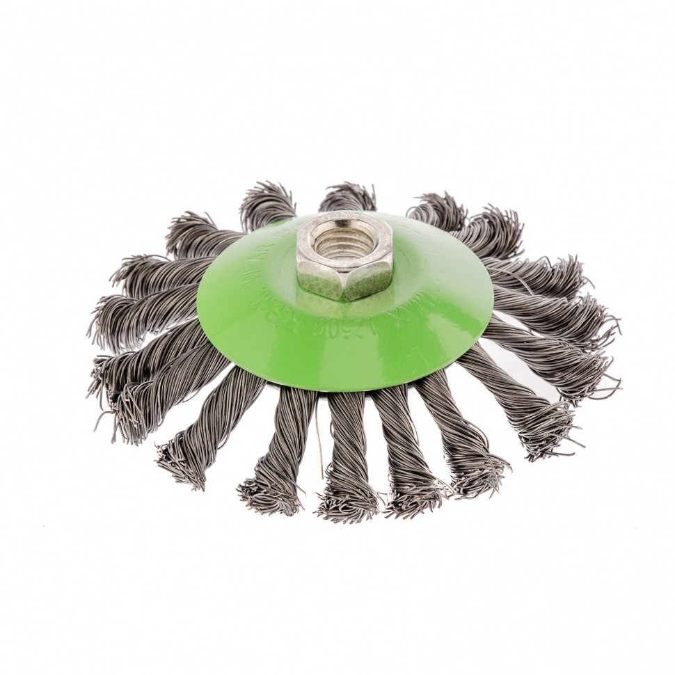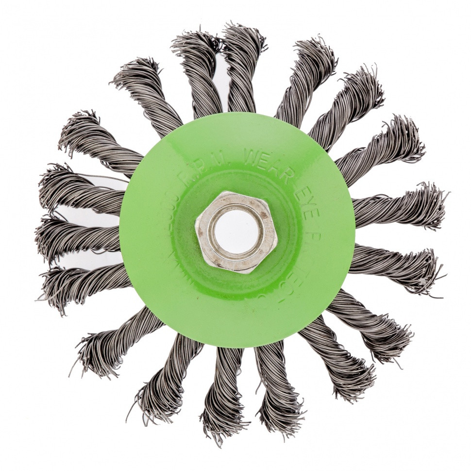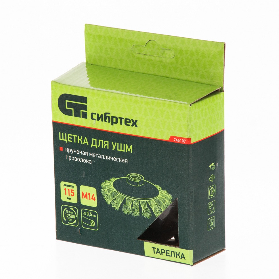 Щетка Сибртех «тарелка» 746107 диаметром 115 мм, с щетиной из крученой проволоки толщиной 0,5 мм, устанавливается на УШМ при помощи гайки М14. Выполнена в форме тарелки, за счет чего подходит для грубой (черновой) обработки плоских и угловых поверхностей. Удаляет ржавчину, загрязнения, лакокрасочные покрытия, подходит для зачистки сварных швов. Использование на скорости до 12500 об/мин позволяет продлить срок службы насадки.