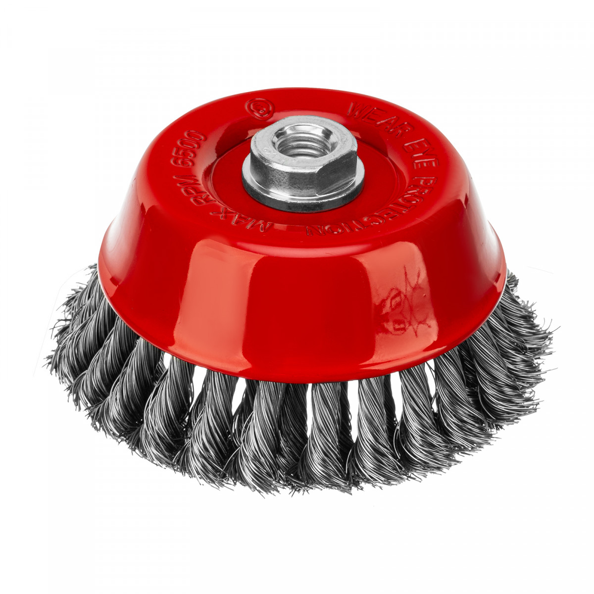 Двухрядная щетка Matrix «Чашка» 74678 диаметром 125 мм, с щетиной из крученой проволоки толщиной 0,35 мм, устанавливается на вал углошлифовальной машины с помощью гайки М14. Рекомендованная максимальная скорость вращения — до 6500 об/мин. Оснастка оптимальна для грубой (черновой) обработки: снятия старого слоя лакокрасочного покрытия и ржавчины, удаления загрязнений, зачистки сварных швов. Эффективно справляется с зачисткой больших поверхностей, подходит для выполнения работ повышенной сложности.