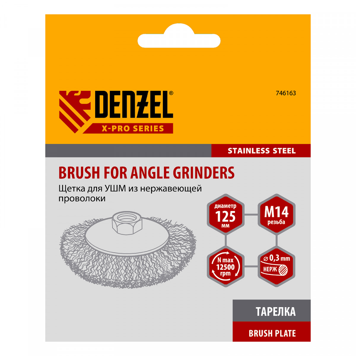 Щетка для УШМ, 125 мм, "Тарелка", витая нержавеющая проволока 0.3 мм, М14 Denzel