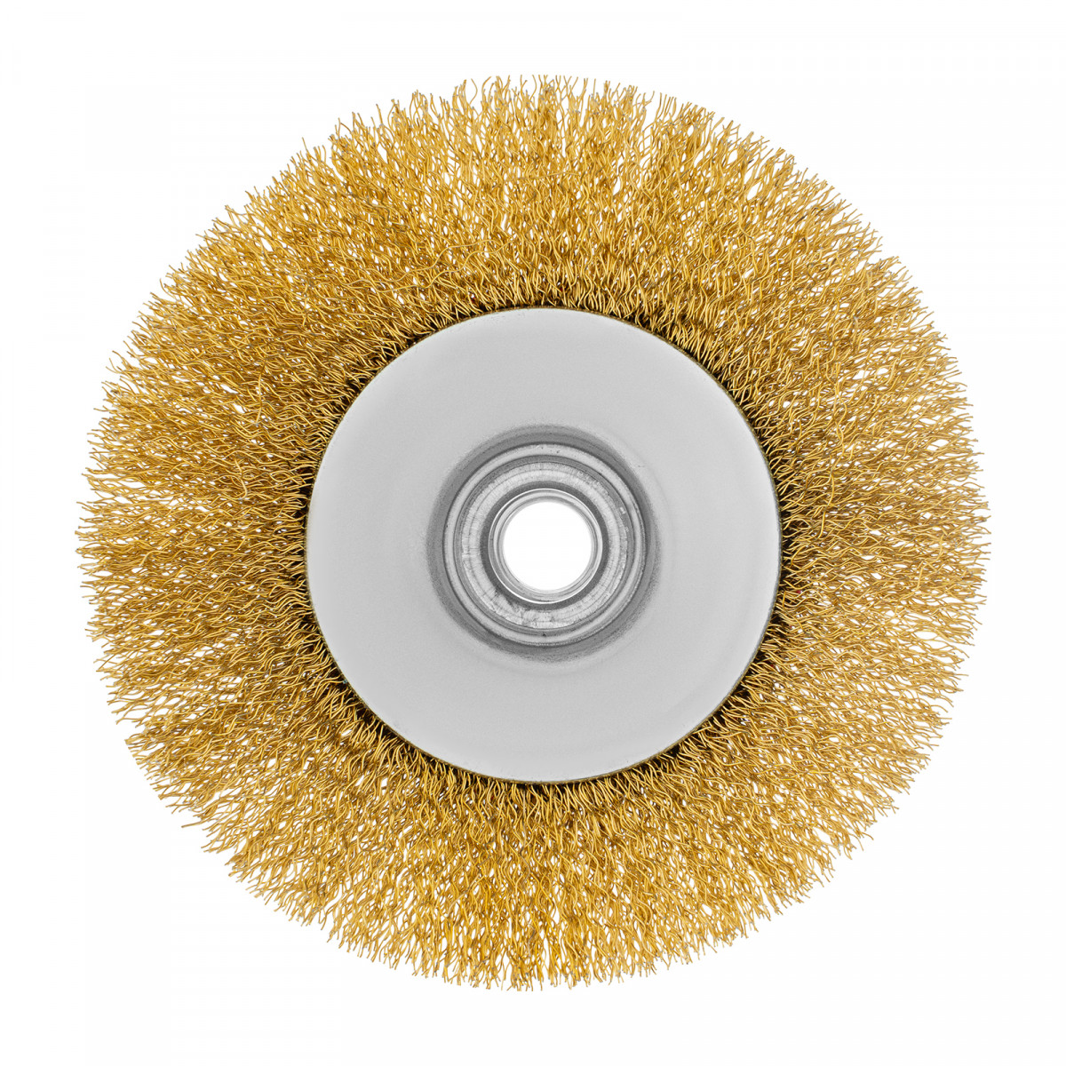 Щетка для УШМ «Тарелка» Denzel 746163, М14, диаметром 125 мм, с щетиной из витой нержавеющей проволоки 0,3 мм, используется для щадящей обработки металлических, в том числе нержавеющих, а также деревянных и пластиковых поверхностей. Постепенно снимает тонкий слой ржавчины, старого лака или краски, удаляет загрязнения. Подходит для придания поверхности заданной шероховатости или подчеркивания структуры дерева. Тарельчатая форма щетки оптимальна для обработки как плоскостей, так и труднодоступных мест. Щетку устанавливают на вал углошлифовальной машины (УШМ), поддерживающей работу со скоростью до 12500 об/мин. Обязательно использование защитных очков, респиратора, перчаток, наушников, спецодежды и обуви. Щетка предназначена для выполнения профессиональных и бытовых работ.