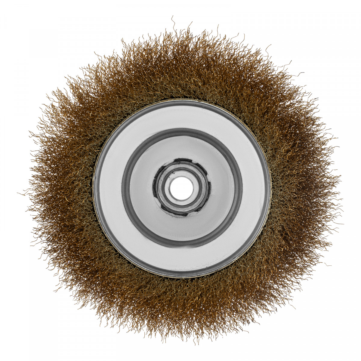 Щетка «чашка» Matrix 74607 диаметром 150 мм, с щетиной из латунированной витой проволоки, устанавливается на вал УШМ с помощью гайки М14. Предназначена для снятия тонкого слоя краски или лака, удаления ржавчины и загрязнений. При рекомендованной скорости вращения 4500 об/мин щеткой можно быстро обрабатывать участки большой площади.