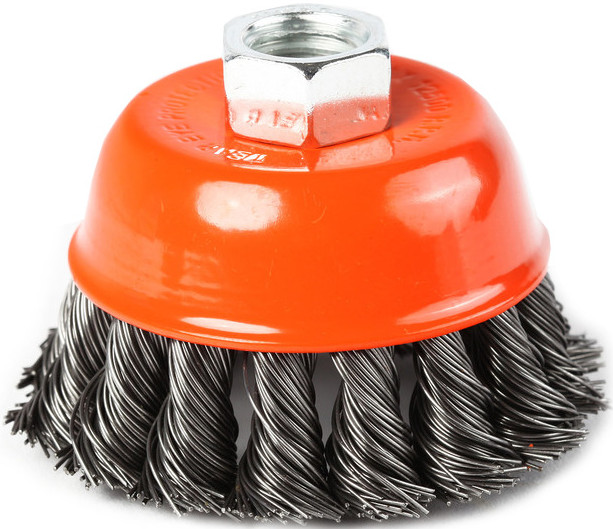 Щетка чашеобразная витая применяется совместно с угловыми шлифовальными машинами и предназначена для снятия лака, краски, зачистки от ржавчины металлических поверхностей и изделий. Рабочая часть состоит из скрученной в пучки стальной проволоки.