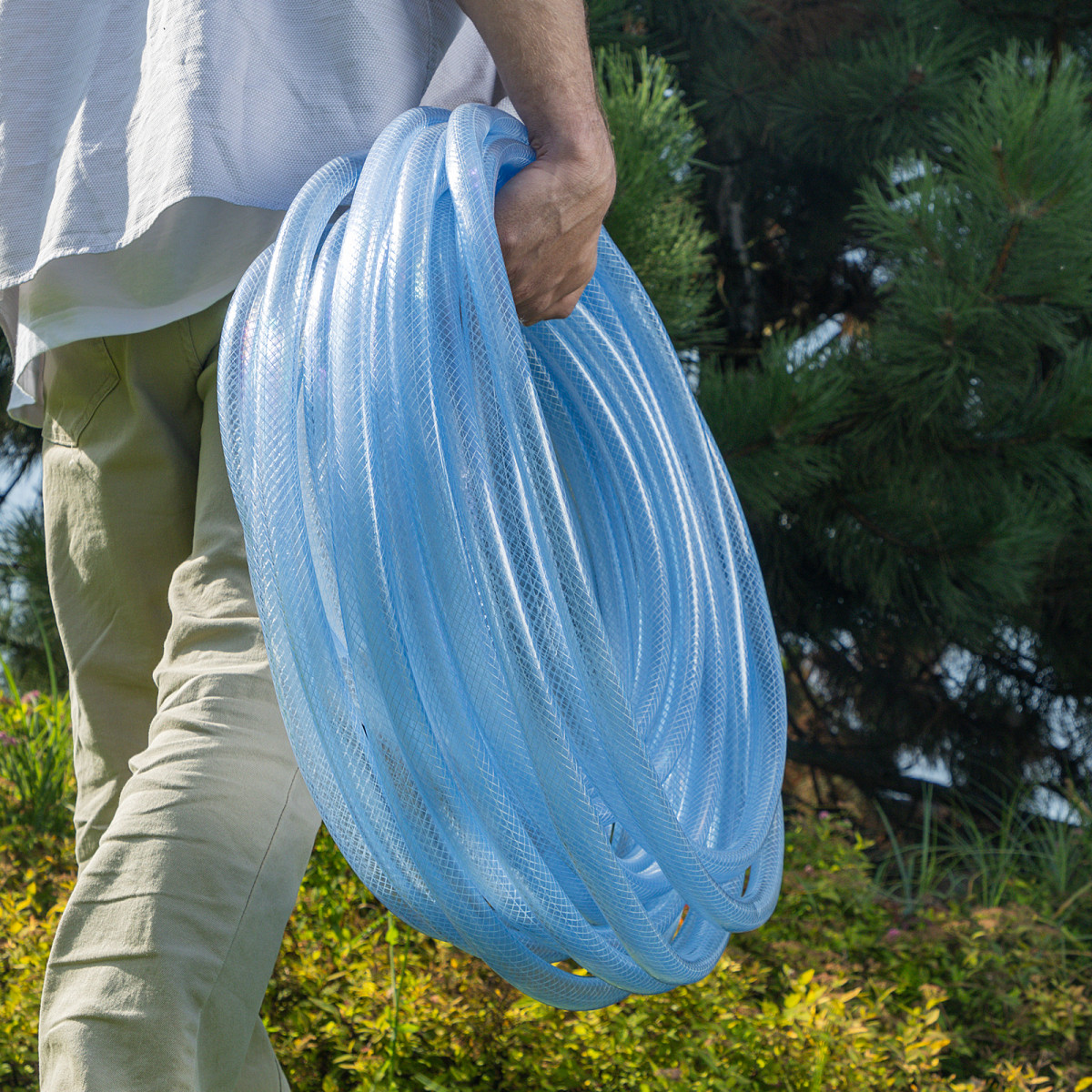 - Повышенная прочность — шланг изготовлен из поливинилхлорида (ПВХ) и армирован нитью из полиэстера.