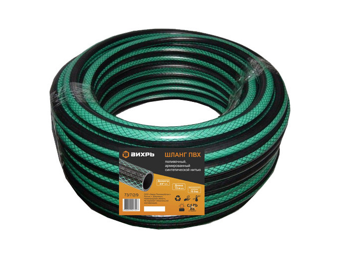 Шланг поливочный трёхслойный армированный Вихрь предназначен для подачи воды на дачных участках. ПВХ хорошо держит форму, не перекручивается. Шланг армирован синтетической нитью, держит давление 10 бар, диаметр 3/4 дюйма, длина шланга 15 метров.