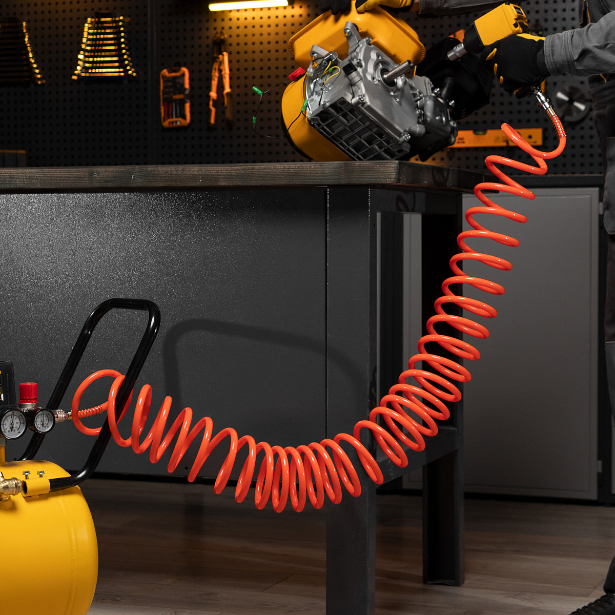 Спиральный воздушный шланг Stels 57019 диаметром 8 х 12 мм, длиной 15 м, с быстросъемными соединениями, выдерживает давление до 18 бар и предназначен для подключения пневматических инструментов к источнику сжатого воздуха. Полиэтилен, из которого изготовлен рукав, характеризуется легкостью и устойчивостью к воздействию агрессивных сред, поэтому шланг не боится контактов со строительными смесями, маслом, бензином, а работа с ним не вызывает усталости. Пригодится во время строительства, ремонтно-отделочных работ, а также будет полезен в мастерской или гараже.