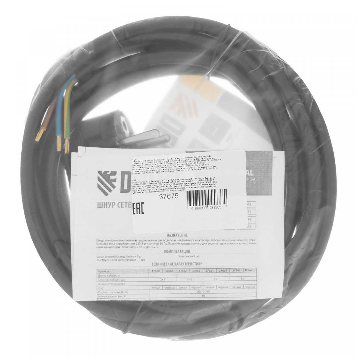 Черный сетевой шнур Denzel Energy Series 37675 с кабелем ПВС сечением 3 x 1,5 мм и длиной 3 м, с неразборной вилкой, предназначен для подключения к сети электроприборов мощностью до 3680 Вт. Для смотанного кабеля максимальная мощность потребителя составляет 1840 Вт. Шнур можно использовать для самостоятельного подключения прибора или замены вышедшего из строя провода. Сделано в России.