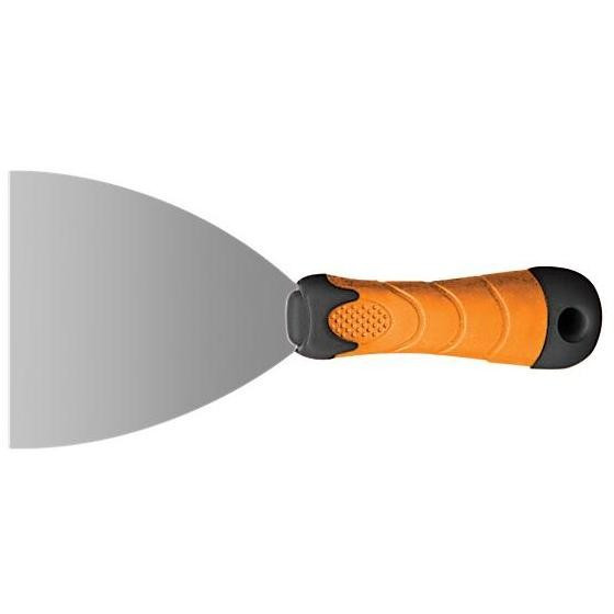 Шпатель из нержавеющей стали для штукатурных работ, эргономичная 2-К ручка. Материал: нержавеющая сталь, прорезиненная ручка.