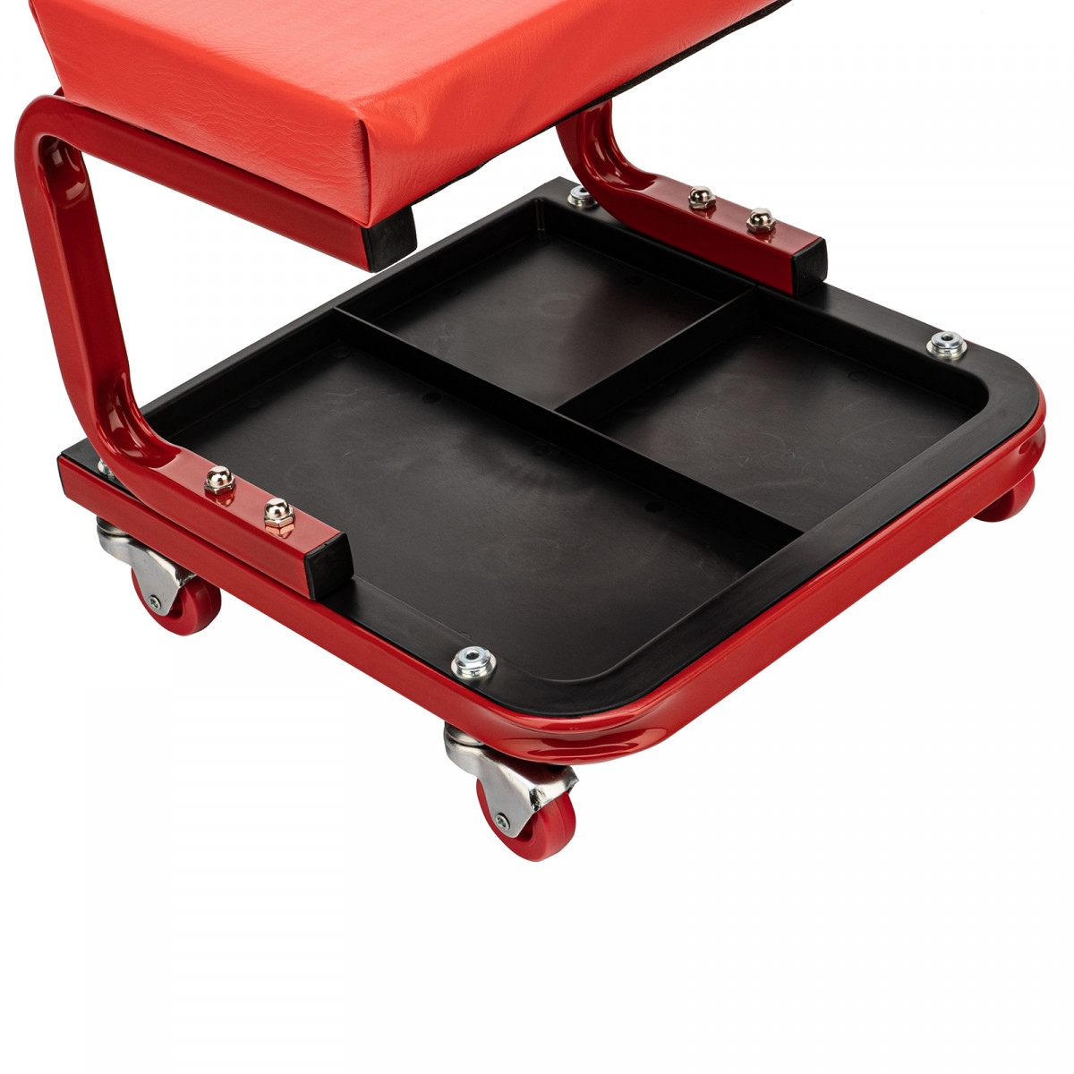 - На сиденье предусмотрены 4 колеса с углом поворота на 360°, поэтому можно с удобством перемещаться по гаражу.