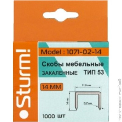 Скоба Sturm 1071-02-14 является сменным элементом для степлеров. Изготовлена из углеродистой стали и закалена. Применяется для скрепления между собой различных материалов. Тип скобы — 53. Количество в упаковке — 1000 шт. Технические характеристики: Тип (общая классификация) 53 Тип (классификация производителя) 53 Фасовка, шт. 1000 Длина, мм 14 Ширина, мм 11.3 Толщина, мм 0.7 Вес, кг: 0,10 Габариты, мм: 75 x 75 x 15