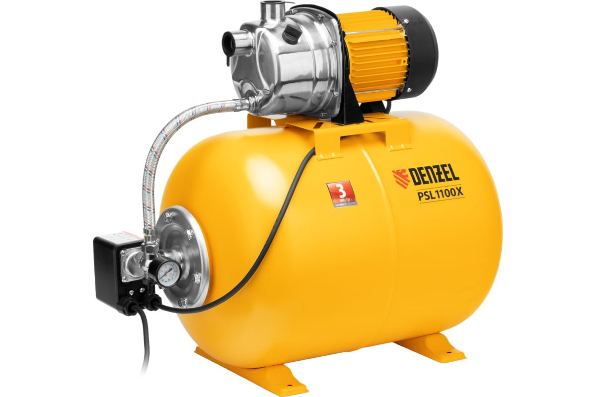 Насосная станция Denzel psl1100x 97311 автоматически поддерживает нужное давление и используется для подачи воды в систему водоснабжения жилого дома или производственного объекта. Бак объемом 50 л позволяет снизить частоту включений насоса, тем самым увеличив срок службы насосной станции. Автономность. Прессостат запускает насос при падении давления в ресивере ниже 1.5 бар и останавливает его по достижении показателя 3 бар. Регулировка рабочих параметров. Пользователь может настроить реле давления, установив требуемые пороговые значения давления.