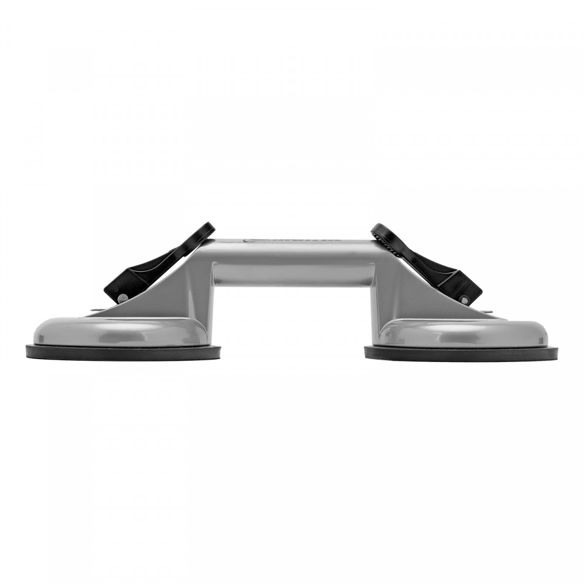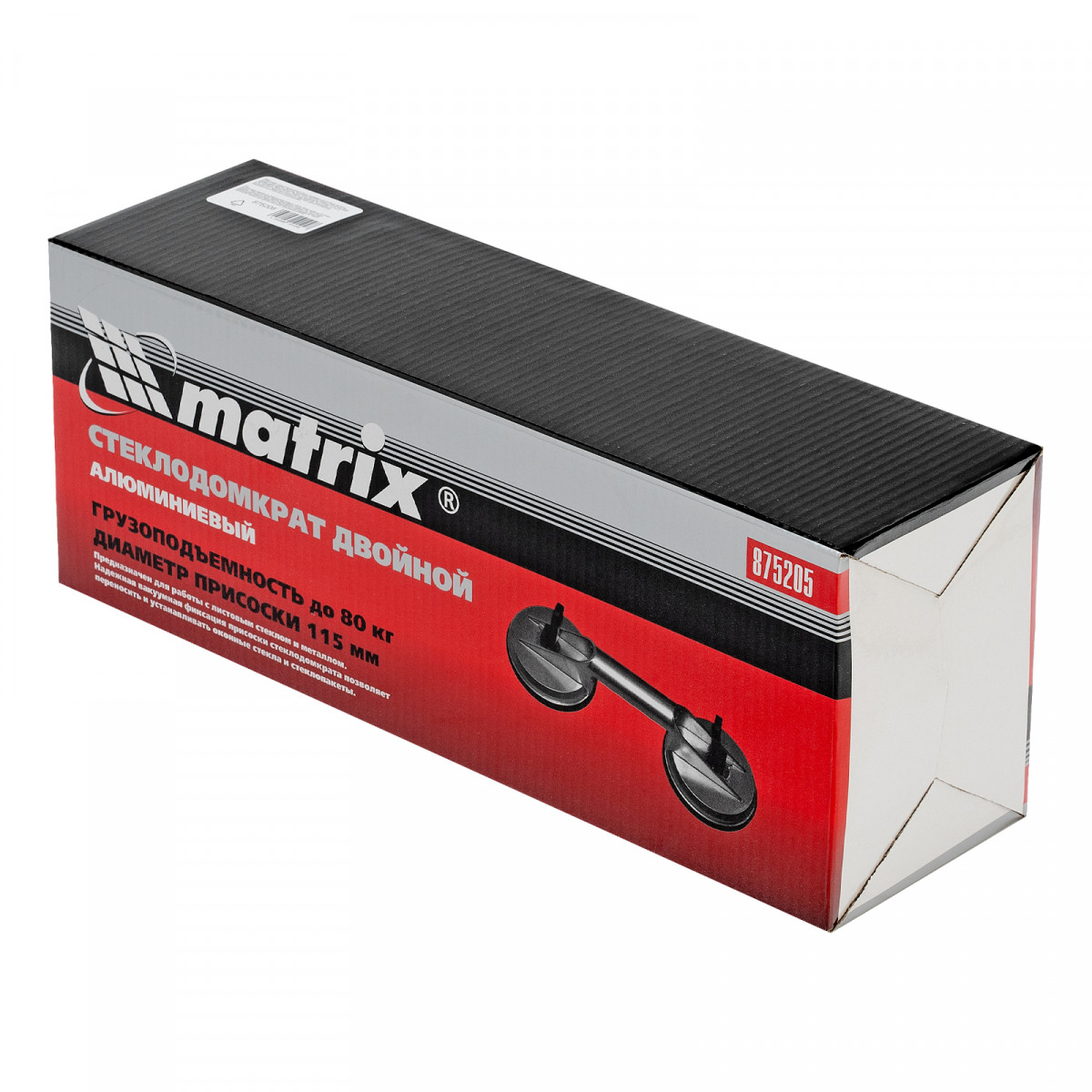 Алюминиевый двойной стеклодомкрат Matrix 875205 позволяет поднимать, переносить и устанавливать стекла, зеркала, плитку, листовой металл и другие гладкие материалы. Имеет две вакуумные присоски, которые бережно и надежно фиксируются на поверхности при помощи зажимов. Стеклодомкрат позволяет длительное время удерживать груз весом до 80 кг. Будет полезен во время строительства, ремонта, а также пригодится в быту.
