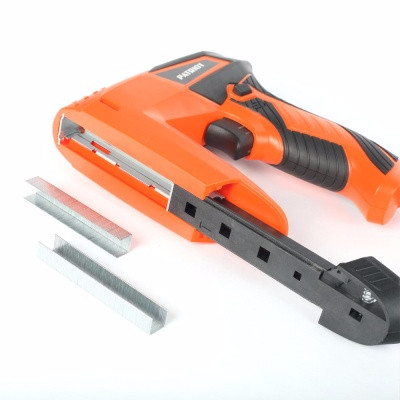 Электрический степлер PATRIOT EN 141 The one 100300100 применяется профессионалами и рядовыми пользователями для закрепления ткани, кожи, плёнки, для работы с панелями из пластика и дерева. Работает с двумя видами крепежа: скобами тип 53/А длиной 8-14 мм и Т-образными гвоздями (тип 48) длиной 15 мм. Надежный захват. Рукоятка с резиновыми накладками ExtraGrip обеспечивает крепкий хват. Готов к работе. В комплекте уже имеется 400 скоб и 100 гвоздей.