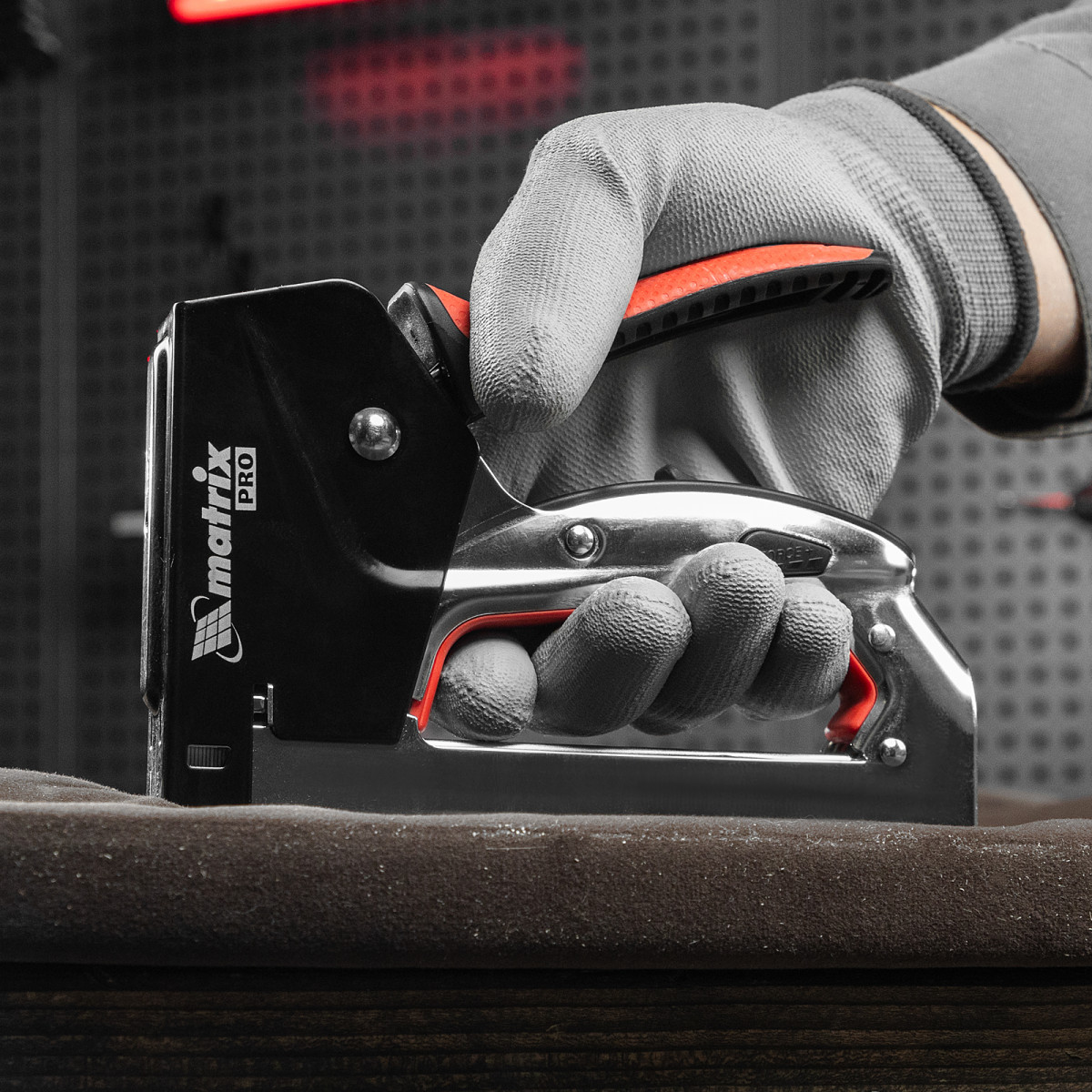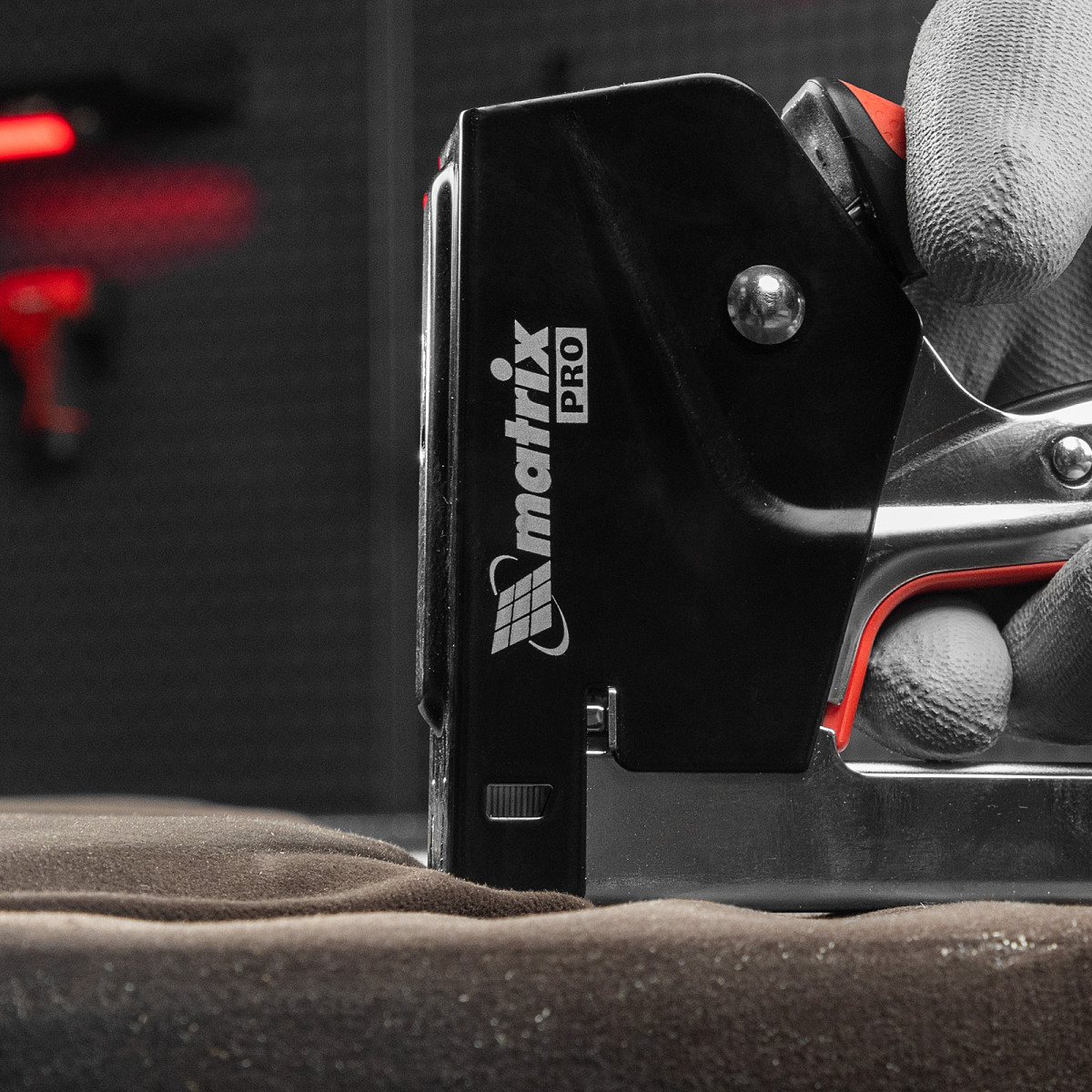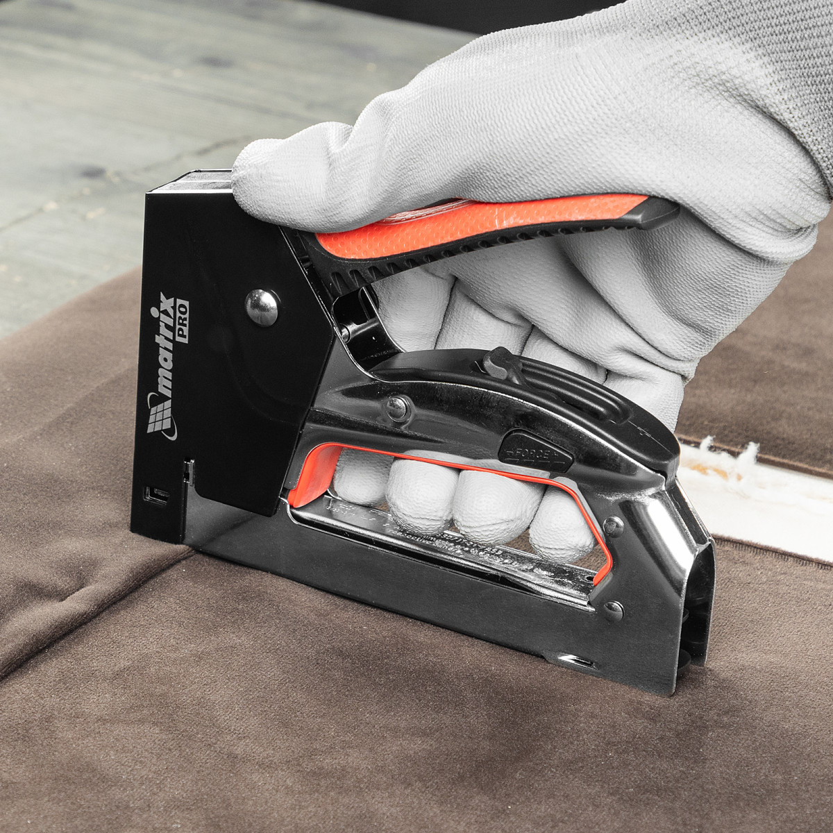 Стальной мебельный степлер Matrix PRO 40917 с механизмом быстрой загрузки скоб помогает быстро закрепить на деревянном основании фанеру, оргалит, ДВП, ДСП, ПВХ-пленку или теплоизоляционный материал с помощью скоб 53 размером 4-14 мм. Двухпозиционный регулятор силы удара позволяет устанавливать глубину забивания скобы в зависимости от твердости скрепляемых материалов. Инструмент подходит для сборки или обивки мебели, укладки ковровых покрытий, проведения ремонтных и отделочных работ.