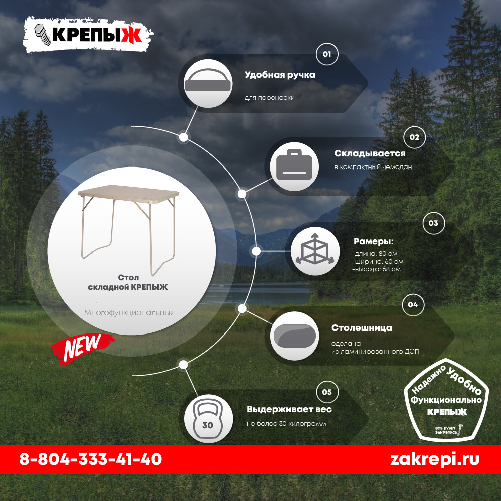 Складной стол КРЕПЫЖ K-21405 выдерживает до 30 кг нагрузки благодаря прочной столешнице из ламинированного ДСП.