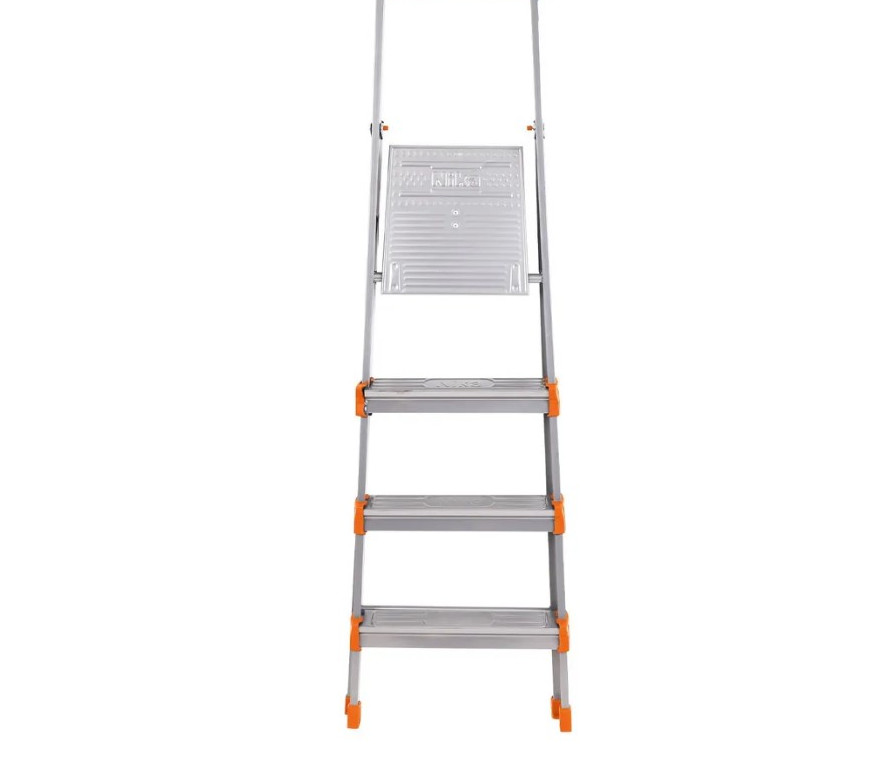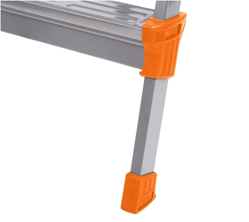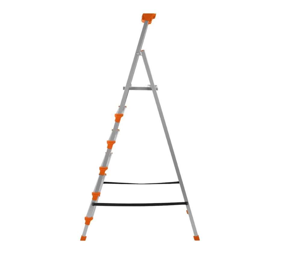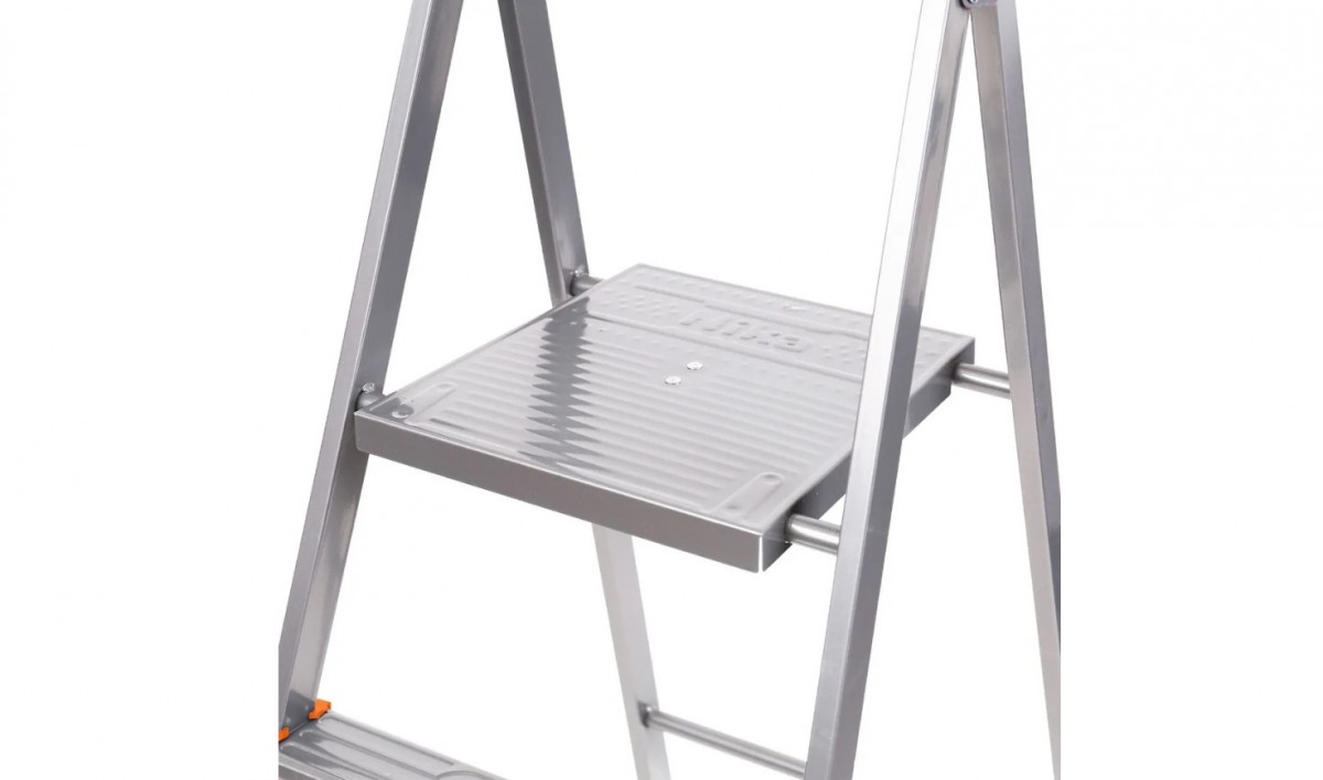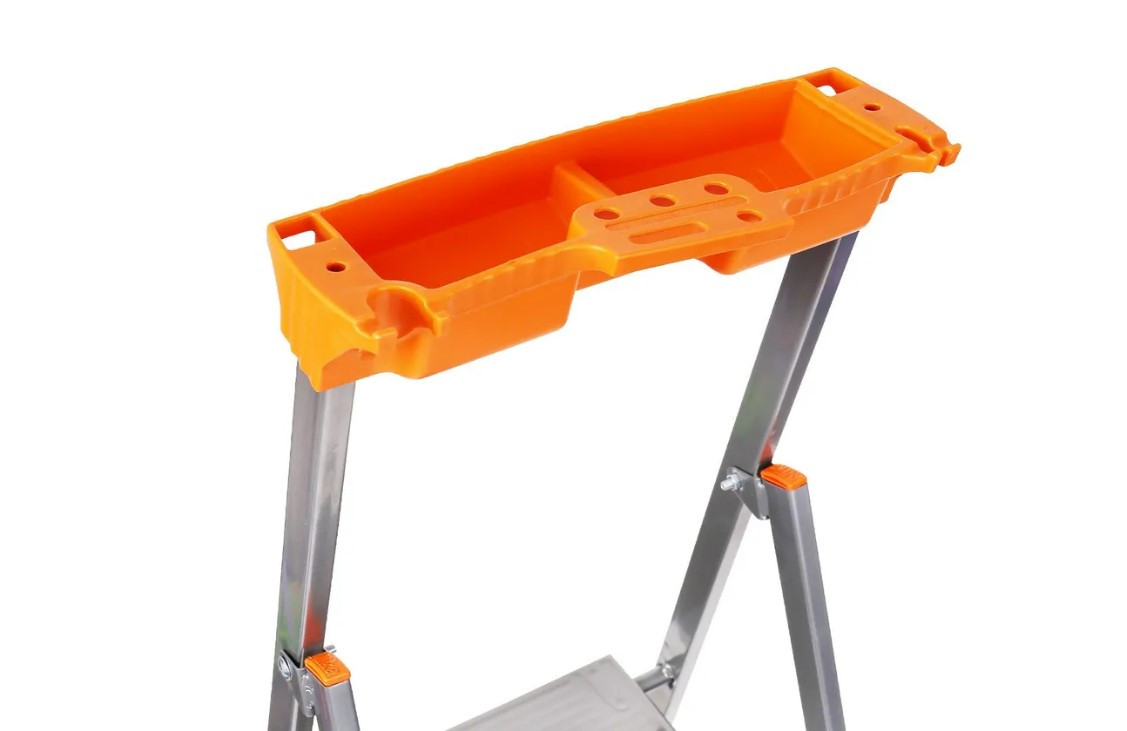 Лестница-стремянка изготавливается из профильной трубы 30*15 мм. Рифлёная поверхность рабочей площадки с широкой ступенью, наличие страховочной стяжки из прочной ленты придают стремянке дополнительную прочность. В комплекте лоток для инструментов.