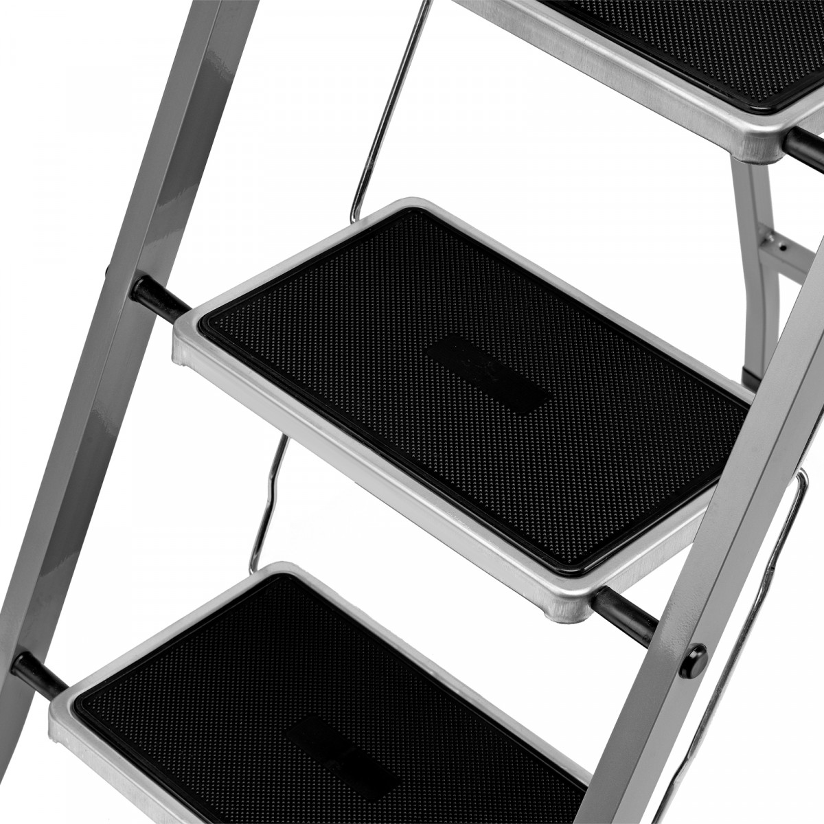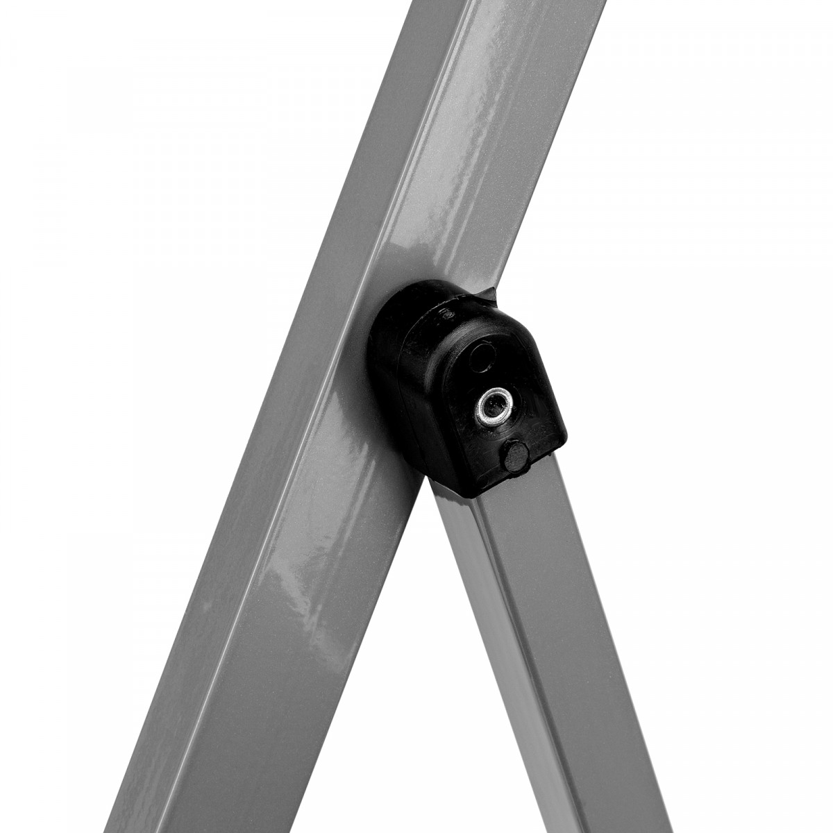 Стремянка выдерживает нагрузку до 120 кг благодаря раме и ступеням из стали.