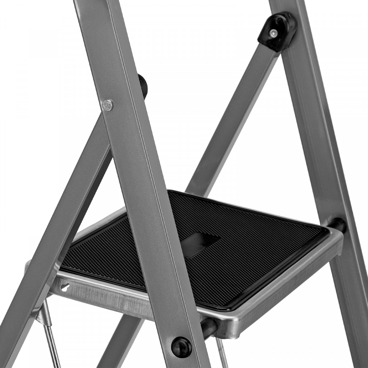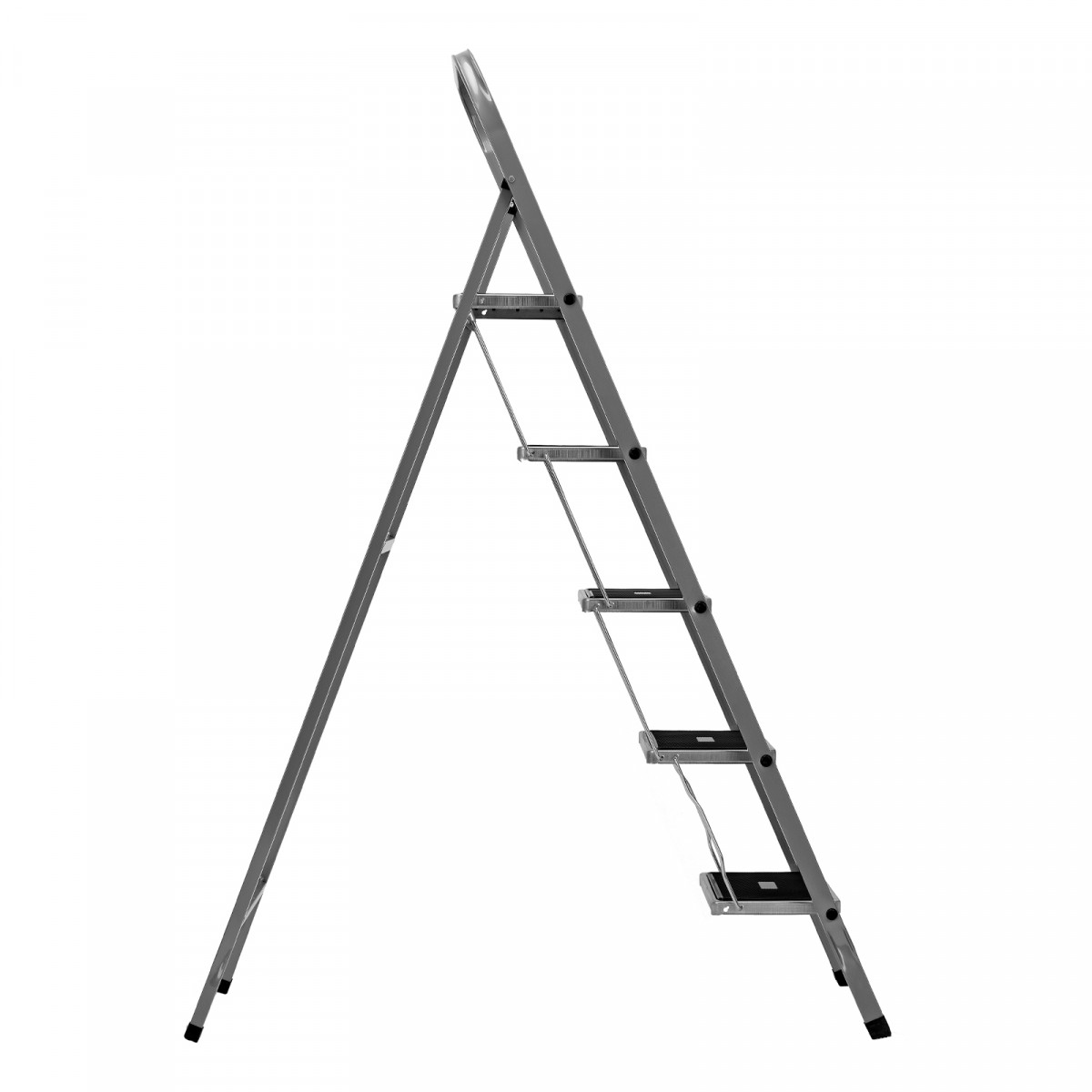 - Прочность — рама и ступени изготовлены из стали, поэтому стремянка выдерживает нагрузку 120 кг.