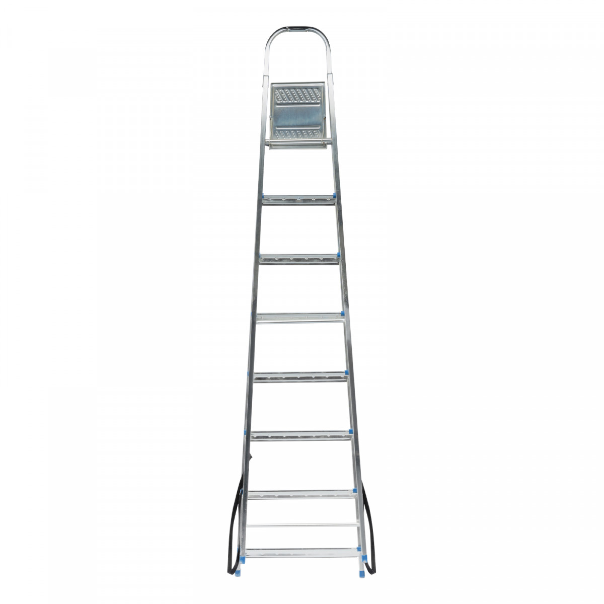 Стальная оцинкованная стремянка Сибртех 97840 с 8 ступенями позволяет выполнять ремонтные и садовые работы, для которых требуется доступ к предметам на высоте. Рама и ступени из стального профиля выдерживают вес до 120 кг. Расстояние от опорной поверхности до площадки составляет 166 см, при среднем росте пользователя 170 см рабочая высота лестницы — 366 см. Необходимо соблюдать технику безопасности: размещать стремянку только на ровной плоскости и не использовать ее для работы с дрелью, шуруповертом и другим электроинструментом.
