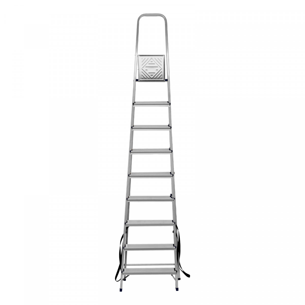Стремянка алюминиевая Сибртех 97719 с 9 ступенями предназначена для выполнения работ на высоте, превышающей человеческий рост. Высокая дуга безопасности обеспечивает устойчивое положение пользователя. Площадка находится на высоте 186,9 см от опорной поверхности, рабочая высота стремянки составляет 386,9 см (при среднем росте пользователя 170 см). Стремянка пригодится во время строительных и ремонтных работ, будет полезна на даче или в гараже.