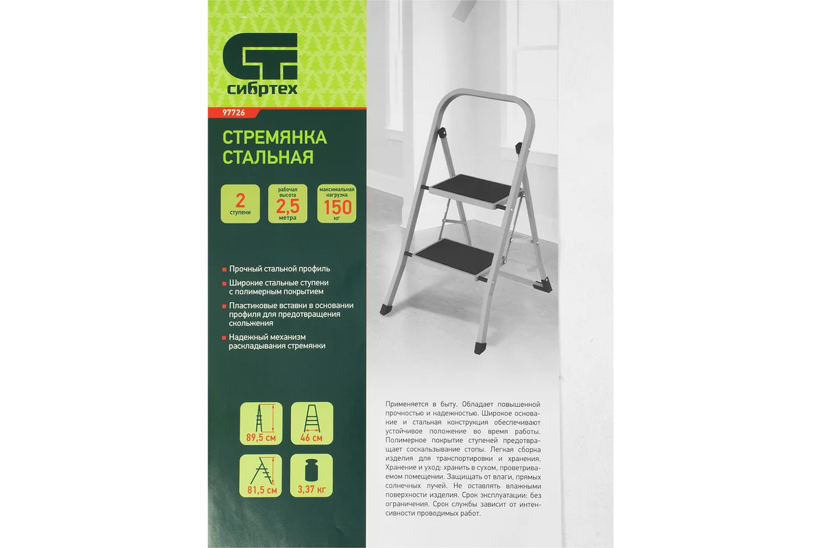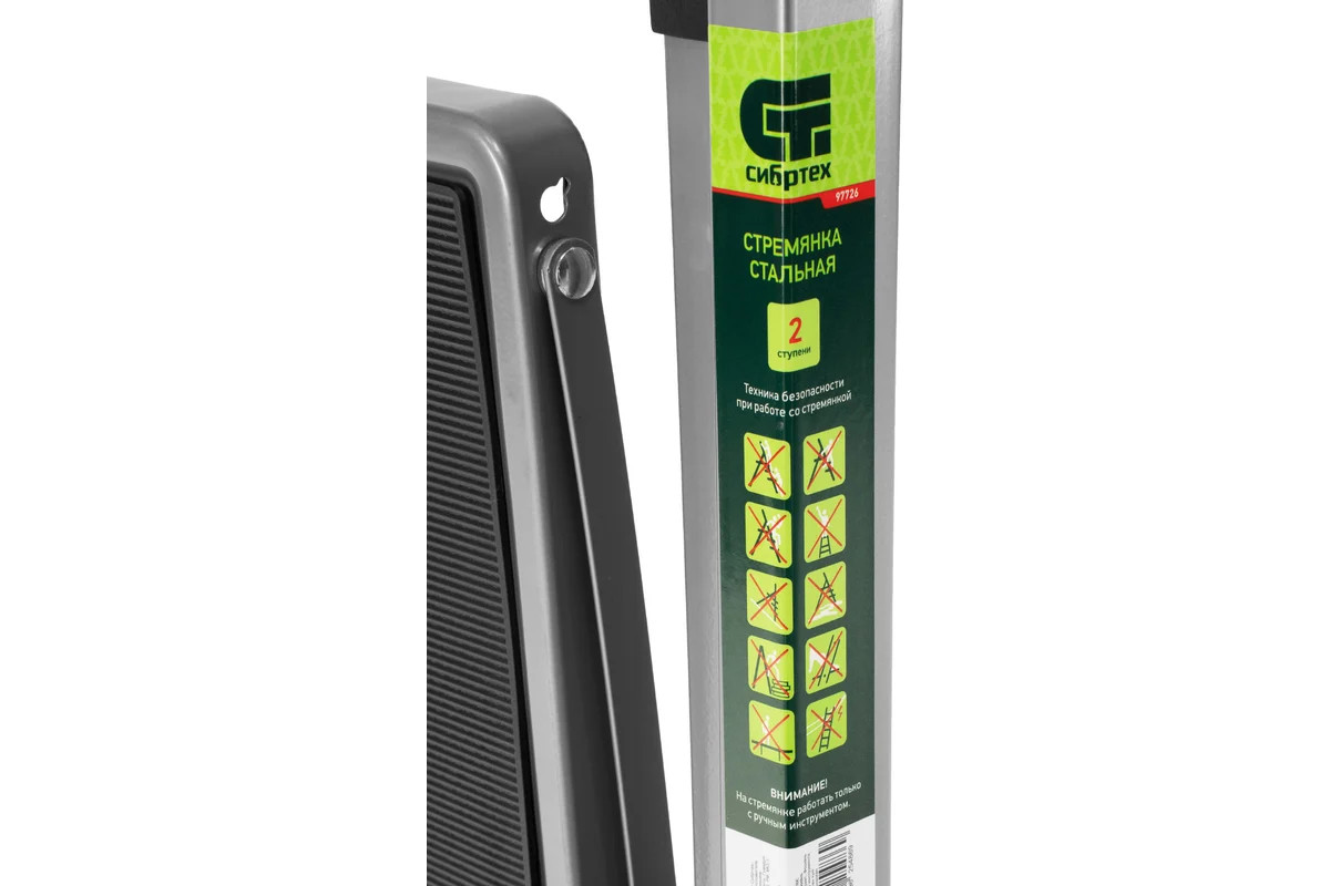 Стальная стремянка Сибртех 97726 с 2 широкими ступенями размером 20 x 30 см, с полимерным покрытием, позволяет выполнять различные работы на высоте, превышающей человеческий рост. С ее помощью можно достать нужный предмет с полки, покрасить стену, поменять лампочку, вытереть пыль на шкафу и т.д. Верхняя ступень находится на высоте 46,7 см от опорной поверхности, рабочая высота составляет 246,7 см (при среднем росте пользователя 170 см). Дуга безопасности и широкие ступени с нескользящим покрытием обеспечивают устойчивое положение пользователя. Стремянку следует размещать на ровной поверхности и использовать для работы только с ручным инструментом.