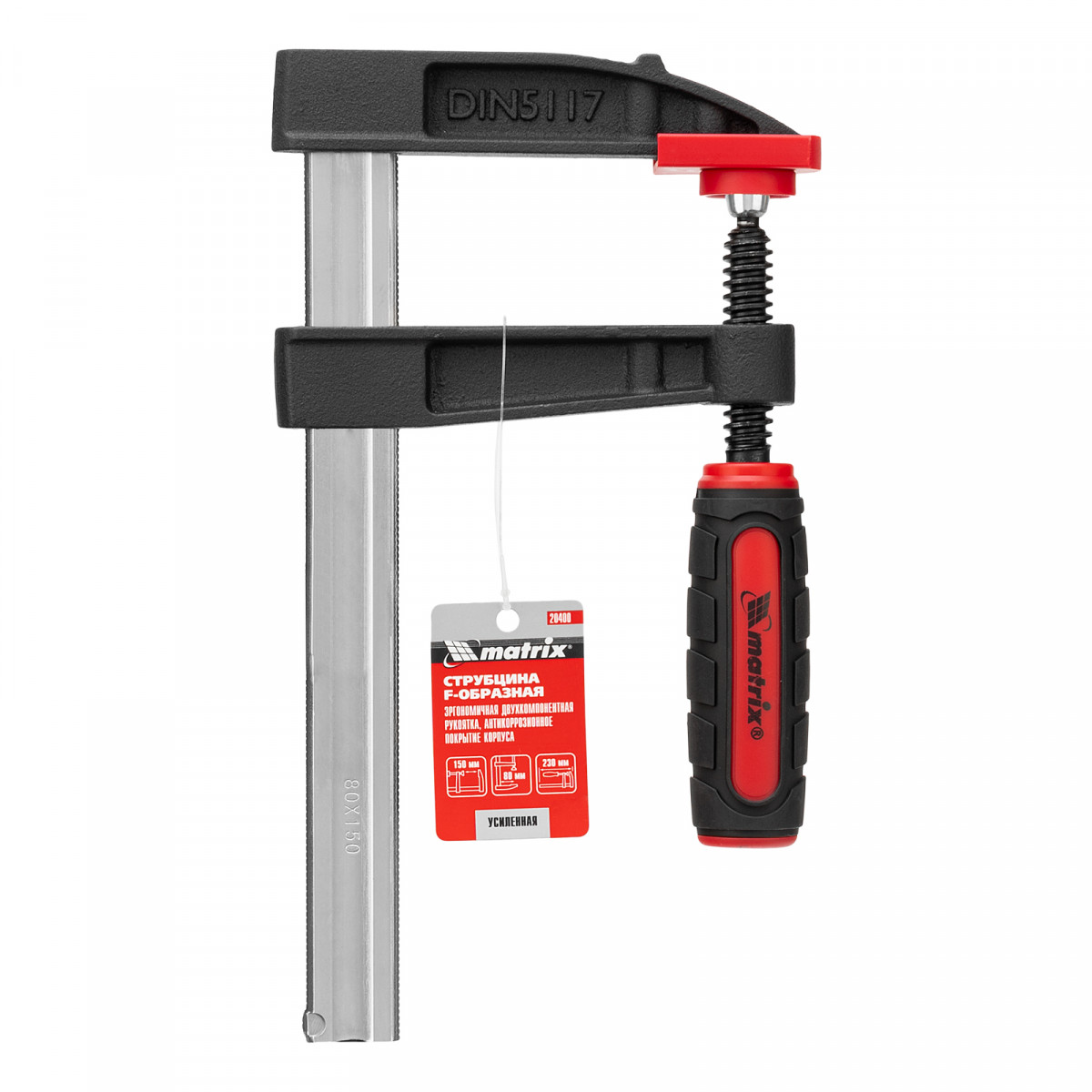 Усиленная F-образная струбцина Matrix 20400 размером 150 х 80 х 230 мм используется для зажима металлических, деревянных и других заготовок для их последующей обработки или сборки. Представляет собой штангу, на которой установлены 2 кронштейна — неподвижный и подвижный. Деталь помещается между ними и прижимается к губкам при помощи винтового зажима с трапециевидной резьбой. Величина захвата регулируется при помощи подвижного кронштейна и может достигать 150 мм. Струбцину используют для проведения слесарных и столярных работ. Металлическая конструкция выдерживает высокую температуру, поэтому инструмент пригодится для выполнения сварочных работ (перед началом необходимо снять пластиковые накладки с губок).
