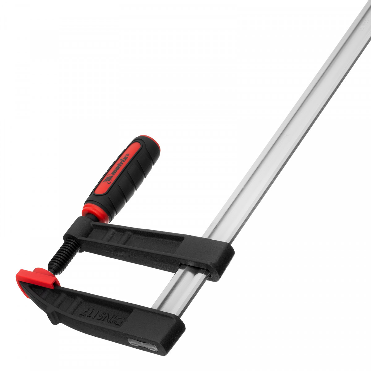 Усиленная F-образная струбцина Matrix 20411 размером 400 х 80 х 500 мм используется для зажима металлических, деревянных и других заготовок для их последующей обработки или сборки. Представляет собой штангу, на которой установлены 2 кронштейна — неподвижный и подвижный. Деталь помещается между ними и прижимается к губкам при помощи винтового зажима с трапециевидной резьбой. Величина захвата регулируется при помощи подвижного кронштейна и может достигать 400 мм. Струбцину используют для проведения слесарных и столярных работ. Металлическая конструкция выдерживает высокую температуру, поэтому инструмент пригодится для выполнения сварочных работ (перед началом необходимо снять пластиковые накладки с губок).