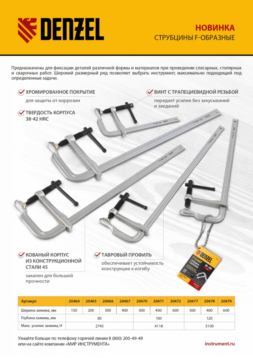 Кованая струбцина Denzel обладает высокой прочностью за счет корпуса из закаленной конструкционной стали.