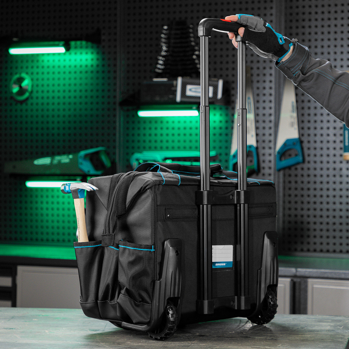 • Мобильность — сумку с инструментами легко перемещать при помощи колес и телескопической рукоятки.