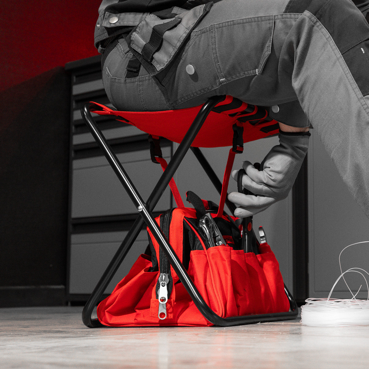 • Многофункциональность — складной стул комплектуется сумкой с вместительным основным отделением и большим количеством карманов, в которых поместятся все необходимые инструменты.