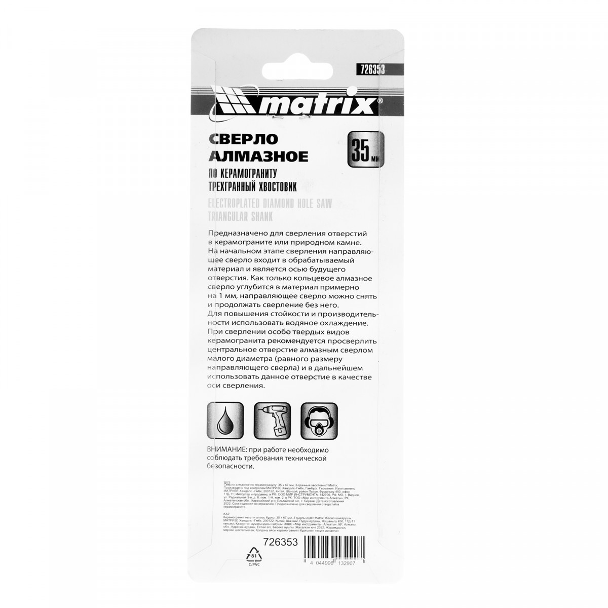 Универсальное алмазное сверло по керамограниту Matrix 726353 размером 35 х 67 мм, с 3-гранным хвостовиком, применяется для получения отверстий в стекле, плитке, кафеле. За счет высокой концентрации алмазов в режущем слое оно легко справляется со сверлением керамогранита. Сверло рассчитано на профессиональное использование с дрелями и шуруповертами. Водяное охлаждение в процессе работы значительно повышает срок службы оснастки.
