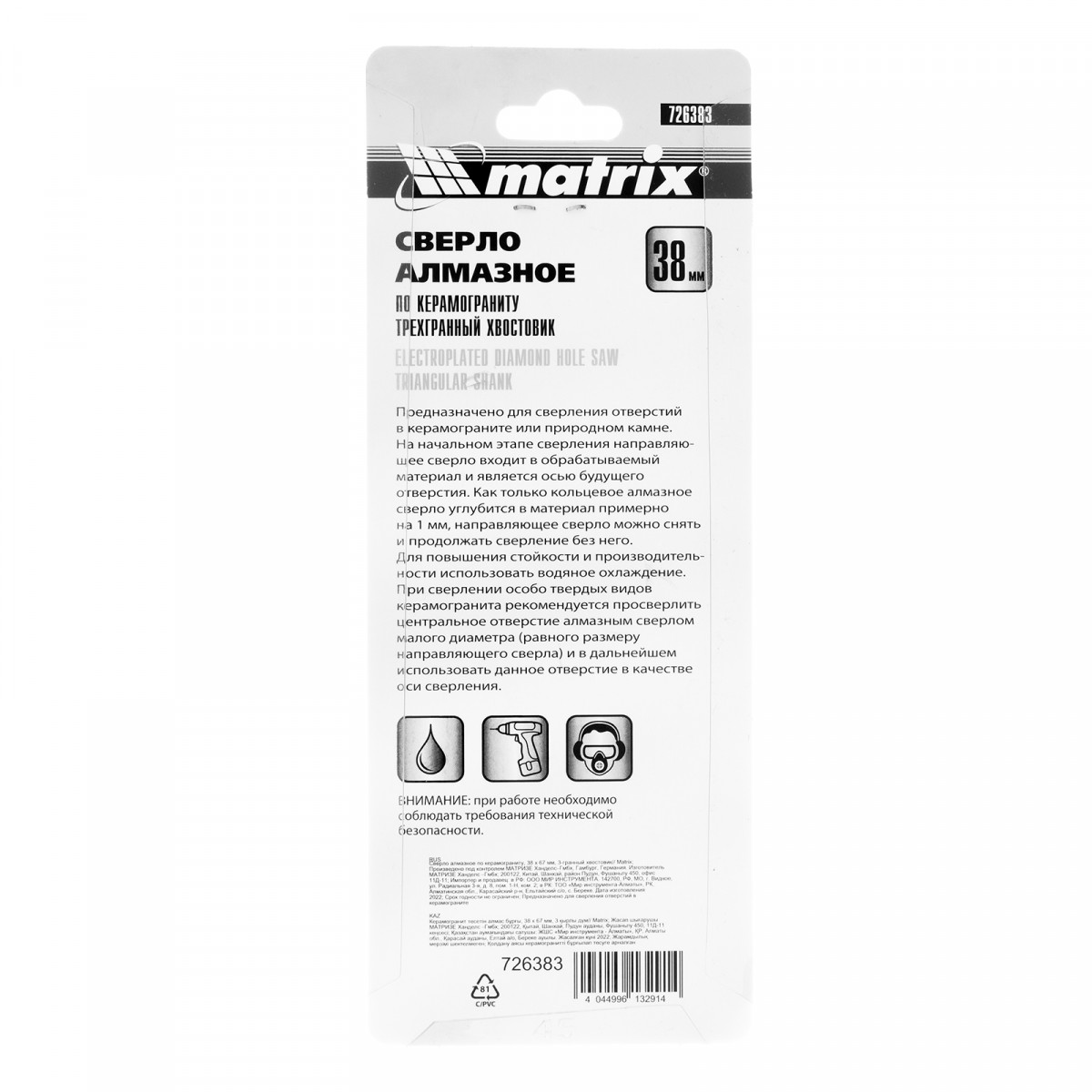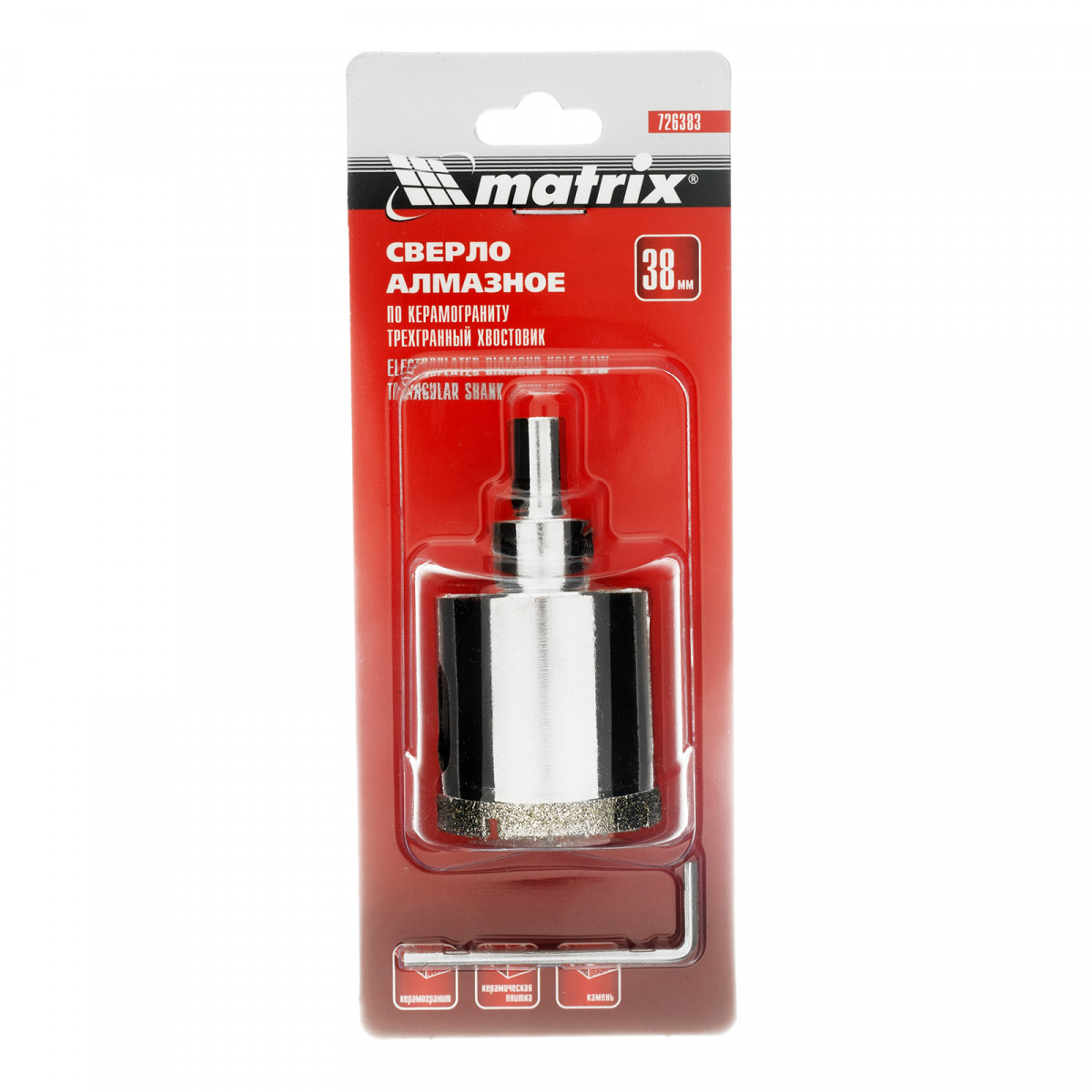 Сверло алмазное по керамограниту, 38 х 67 мм, трехгранный хвостовик Matrix