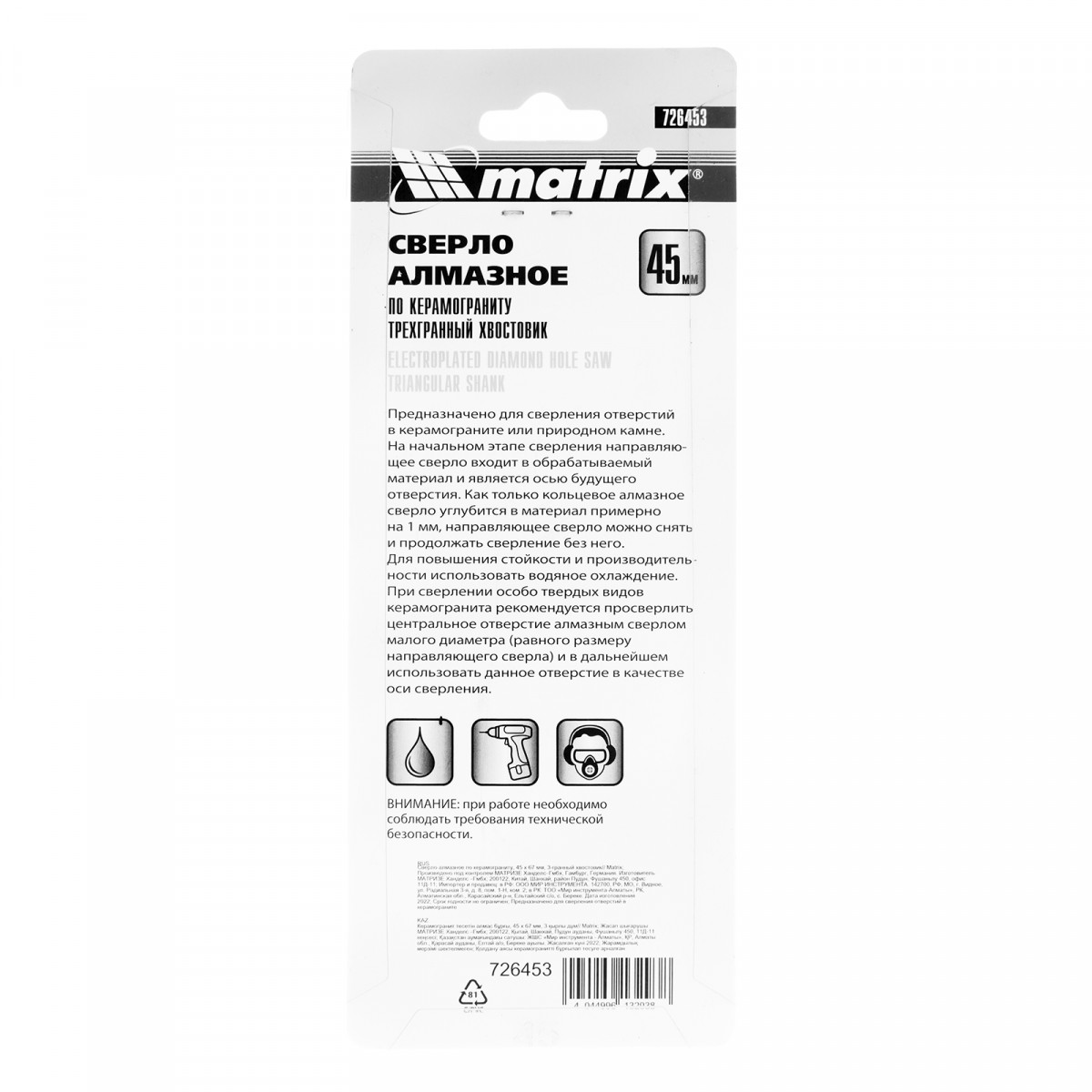 Универсальное алмазное сверло по керамограниту Matrix 726453 размером 45 х 67 мм, с 3-гранным хвостовиком, применяется для получения отверстий в стекле, плитке, кафеле. За счет высокой концентрации алмазов в режущем слое оно легко справляется со сверлением керамогранита. Сверло рассчитано на профессиональное использование с дрелями и шуруповертами. Водяное охлаждение в процессе работы значительно повышает срок службы оснастки.