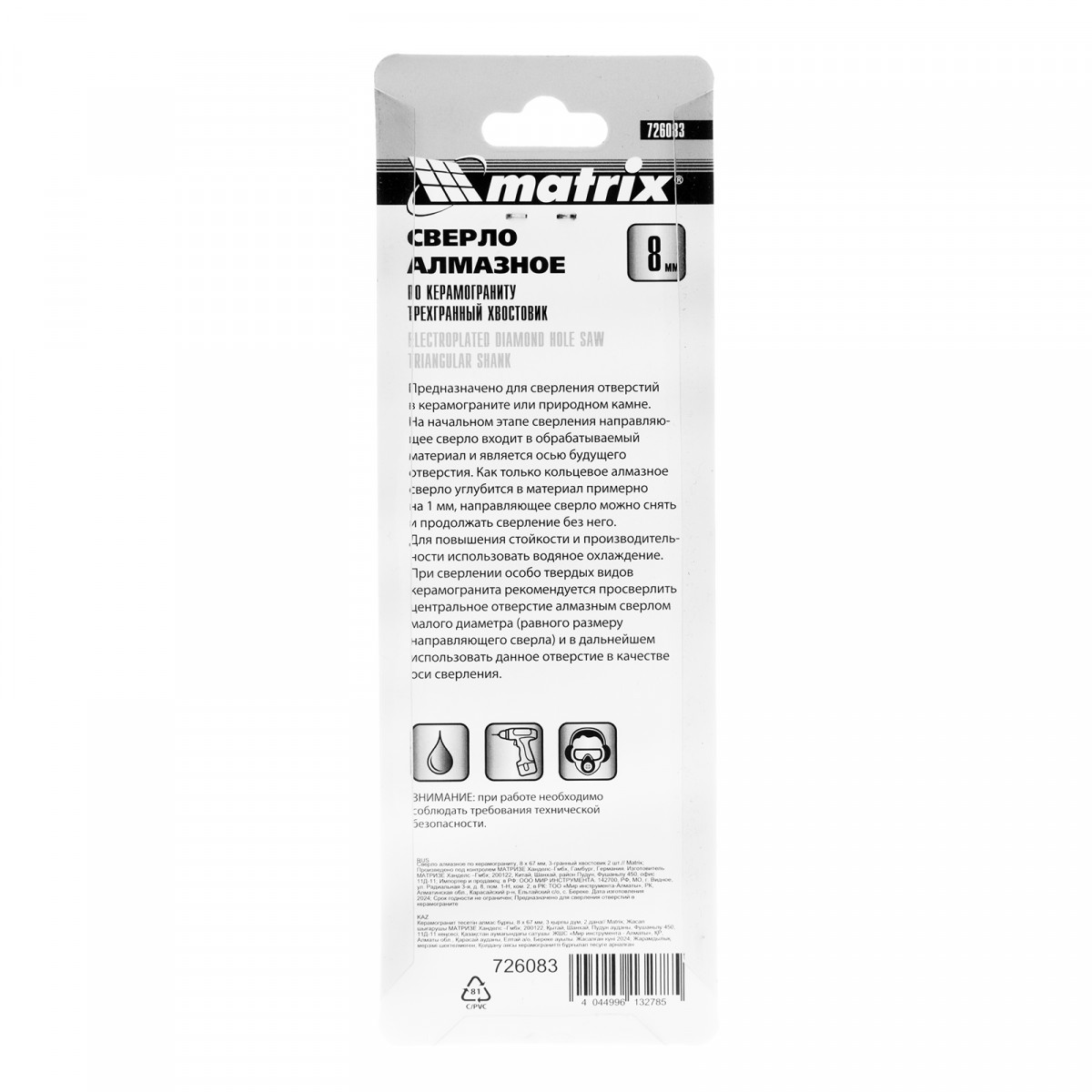 Универсальное алмазное сверло по керамограниту Matrix 726083 размером 8 х 67 мм, с 3-гранным хвостовиком, 2 шт. в упаковке, применяется для получения отверстий в стекле, плитке, кафеле. За счет высокой концентрации алмазов в режущем слое оно легко справляется со сверлением керамогранита. Сверло рассчитано на профессиональное использование с дрелями и шуруповертами, рекомендованная скорость составляет 350-700 об/мин. Водяное охлаждение в процессе работы значительно повышает срок службы оснастки.