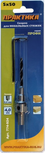 Сверло с зенкером для мебельных стяжек ПРАКТИКА. Предназначено для сверления отверстий под мебельную стяжку за один проход в дереве и ДСП. Обеспечивает зенкование под потайную шляпку. Размер: 5 x 50 мм.