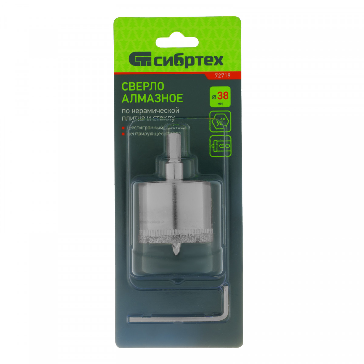 Сверло Сибртех 72719 размером 38 х 55 м, с шестигранным хвостовиком и центрирующим сверлом, позволяет получать отверстия в керамической плитке и стекле. Его устанавливают на дрель или шуруповерт, рекомендуемый диапазон рабочих оборотов 350-700 об/мин. Оснастка используется при выполнении бытовых ремонтных и отделочных работ.