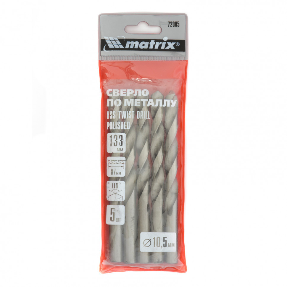 Сверло по металлу, 10.5 мм, полированное, HSS, 5 шт, цилиндрический хвостовик Matrix