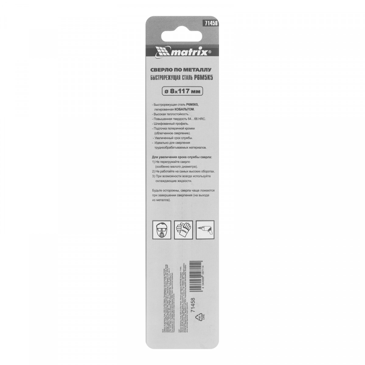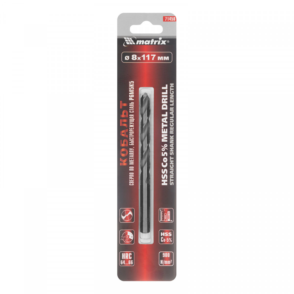 Сверло Matrix 71458 диаметром 8 мм, из стали HSS Co-5%, имеет угол заточки 135°, оптимальный для сверления легированных и цветных металлов. Подходит для профессионального использования на строительной площадке.