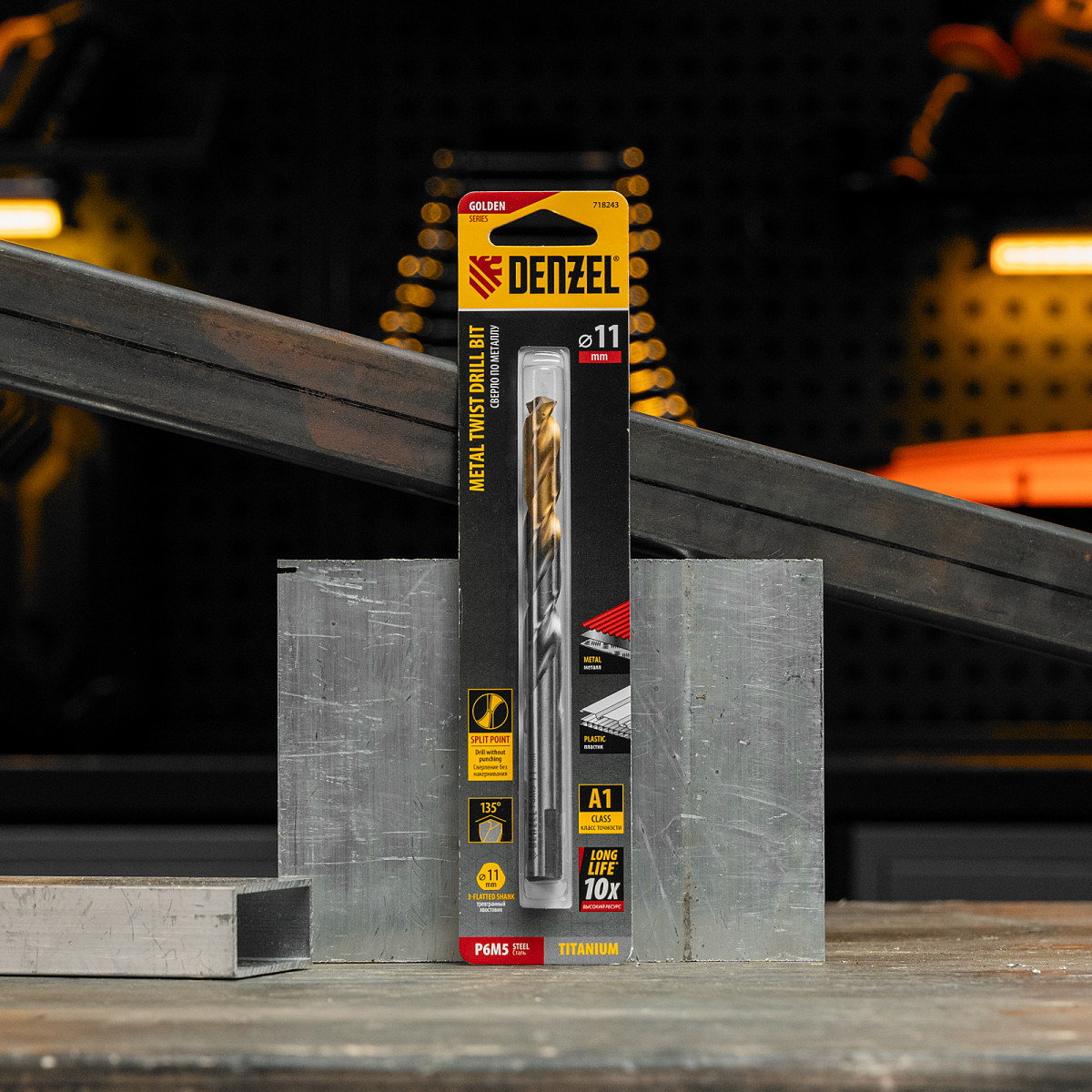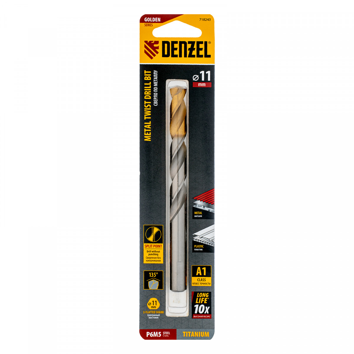 Спиральное сверло по металлу Denzel Golden Tip 718243 из стали P6M5, размером 11 х 142 мм, предназначено для получения отверстий в легированных и цветных металлах — меди, алюминии, мягкой бронзе, титане, латуни. Оснастка позволяет эффективно справляться с поставленными задачами благодаря оптимальному углу заточки 135°. Класс точности A гарантирует высокое качество полученных отверстий. Сверло используется для проведения монтажно-сборочных работ.
