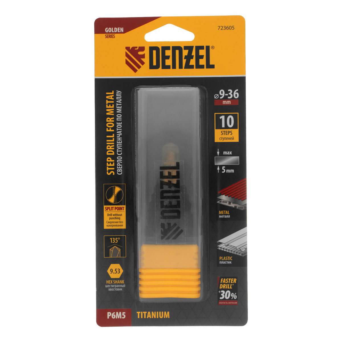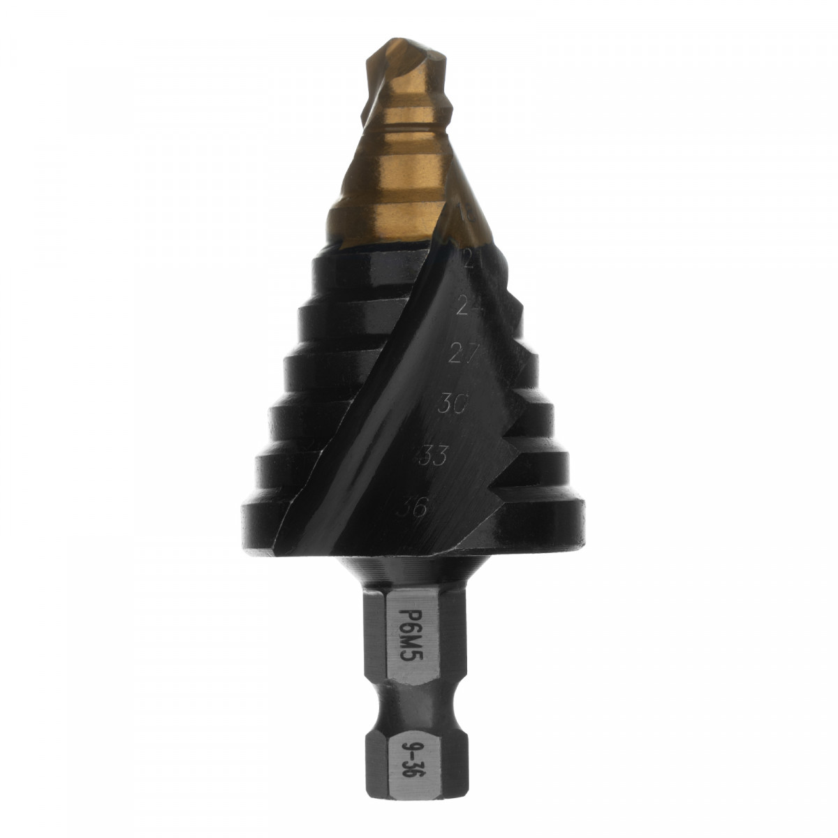Сверло ступенчатое, 9-12-15-18-21-24-27-30-33-36 мм, Р6М5, 6-гр. хвостовик Denzel