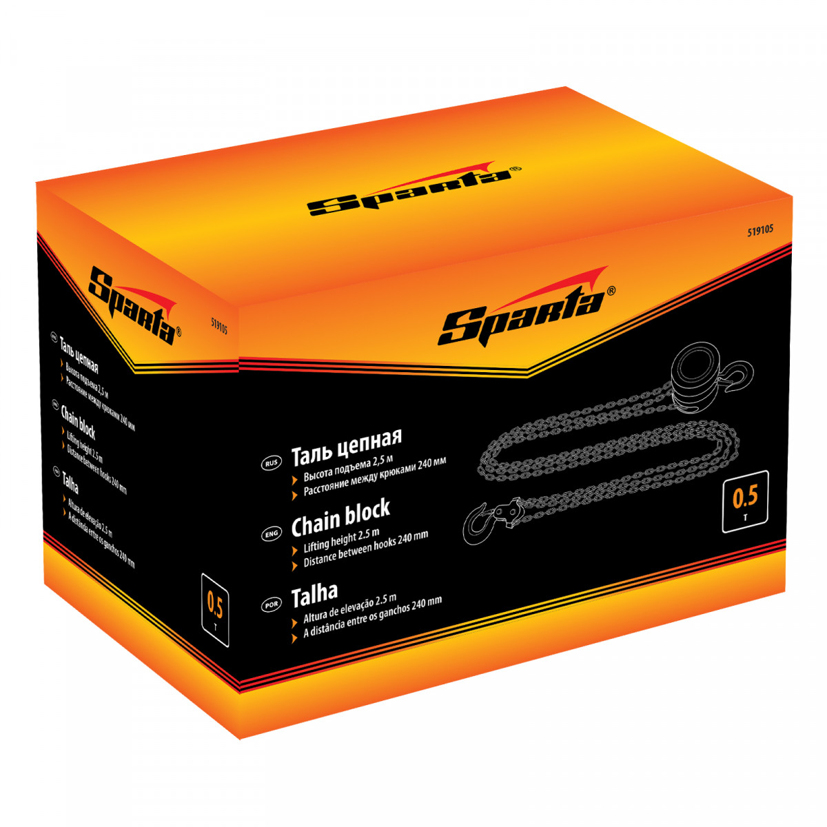 Цепная таль Sparta 519105 с расстоянием между крюками 240 мм предназначена для подъема грузов весом не более 0,5 т на высоту до 2,5 м. При этом пользователь стоит внизу, а шестеренный механизм передает усилие на цепь. С помощью тали можно поднимать тяжести на производстве, в автосервисе, на строительной площадке и т.д.