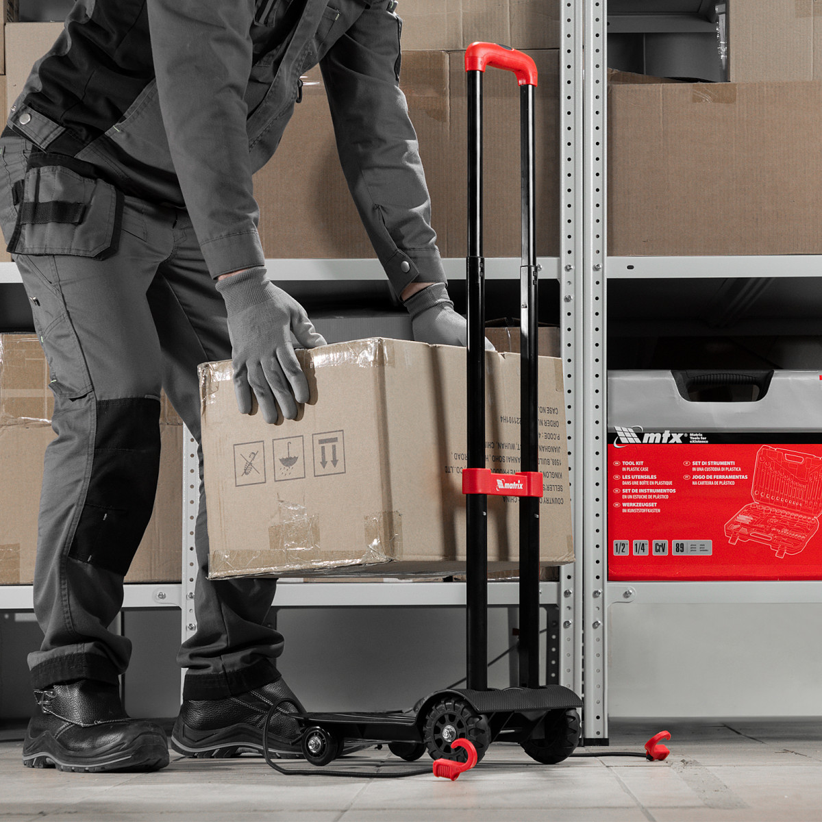 Складная хозяйственная 4-колесная тележка Matrix 98205 предназначена для перемещения грузов массой до 40 кг. Телескопическая рукоятка позволяет регулировать высоту тележки в соответствии с ростом пользователя. Для размещения груза предусмотрена платформа размером 230 x 250 мм.