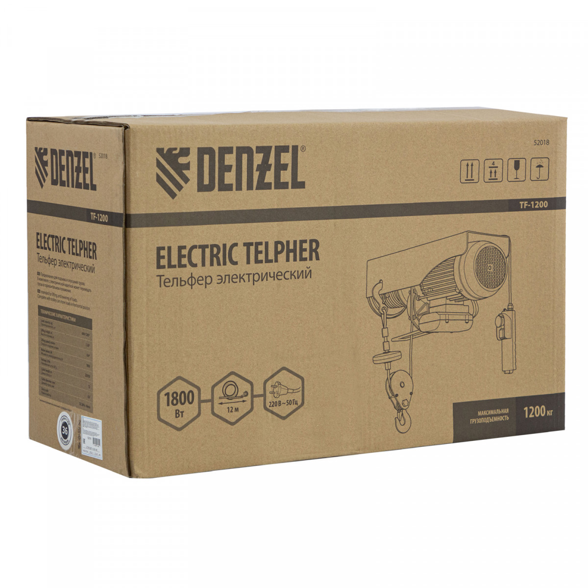 Тельфер электрический TF-1200,1.2 т, 1800 Вт, высота 12 м, 8 м/мин Denzel