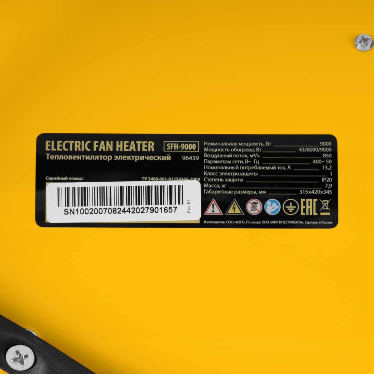 Тепловая пушка SFH-9000, 400 В, 850 м3/ч, вентилятор 3 режима, 6000/9000 Вт Denzel