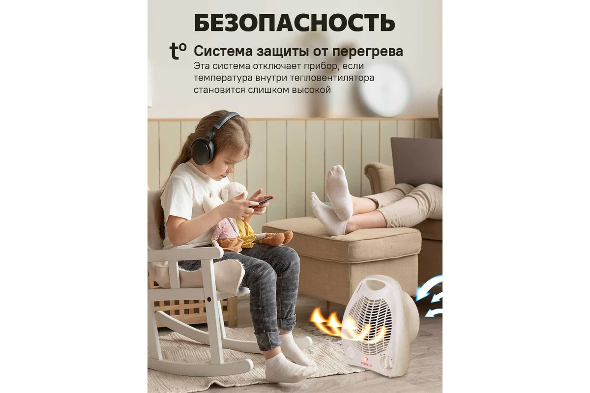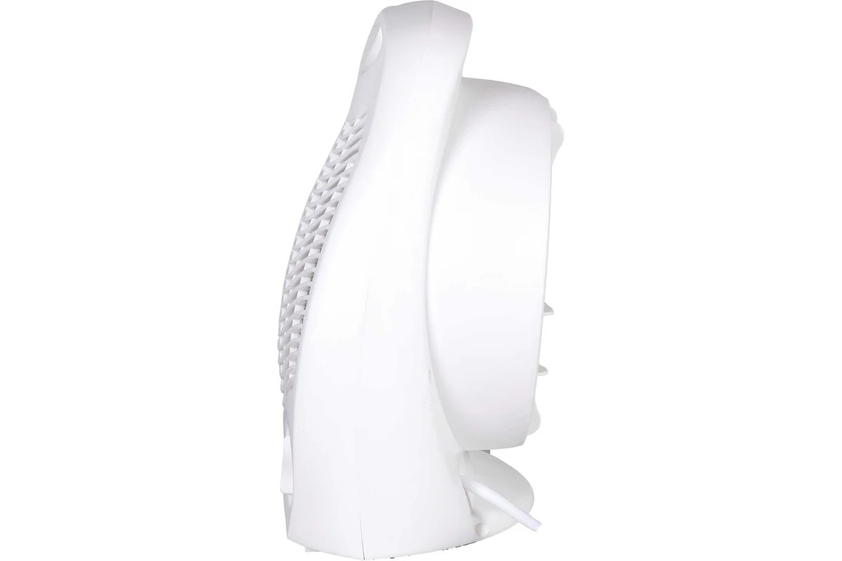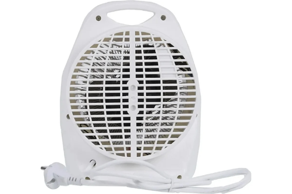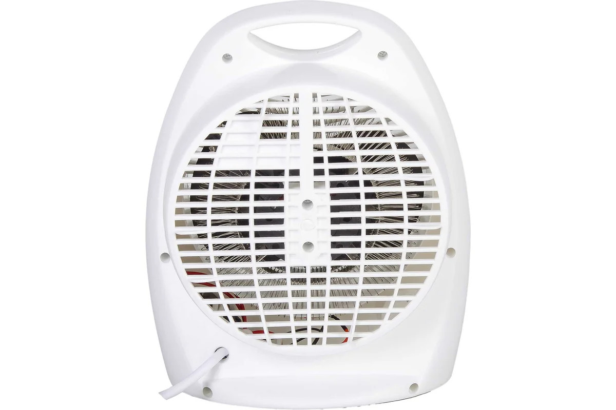 Основу конструкции составляют спиральный нагревательный элемент и вентилятор, обеспечивающий принудительное нагнетание воздуха внутрь устройства и более быстрое размешивание теплых и холодных воздушных масс. Тепловентилятор работает в трех режимах: интенсивный нагрев, средняя мощность, вентиляция без участия нагревательного элемента. Устройство имеет систему термозащиты. В случае перегрева рабочей части или снижения потока воздуха, поступающего внутрь, прибор будет обесточен. В этом случае рекомендуется повернуть регулятор в режим OFF, отключить устройство от сети и дать ему остыть. В профилактических целях прибор следует периодически очищать от пыли. Корпус выполнен из белого пластика, имеет эргономичный стильный вид, оснащен ручкой для более удобного перемещения. Вес устройства – 1,1 кг.