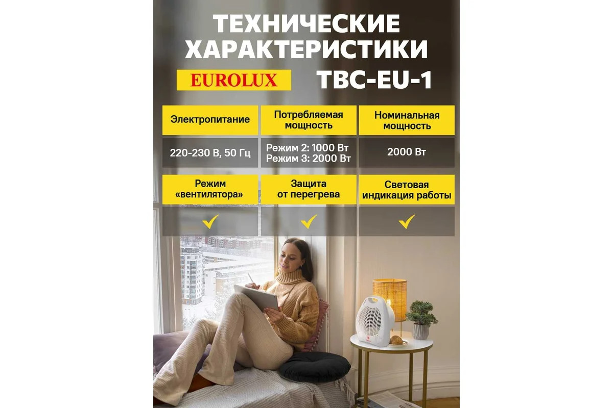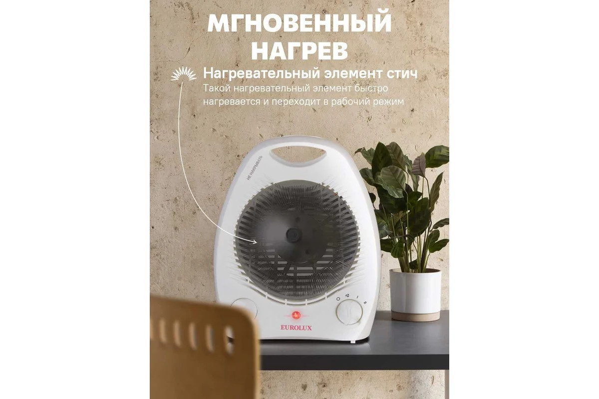 Компактная и надежная модель Eurolux TBC-EU-1 подойдет для жилых комнат, служебных и рабочих помещений, требующих обогрева или вентилирования