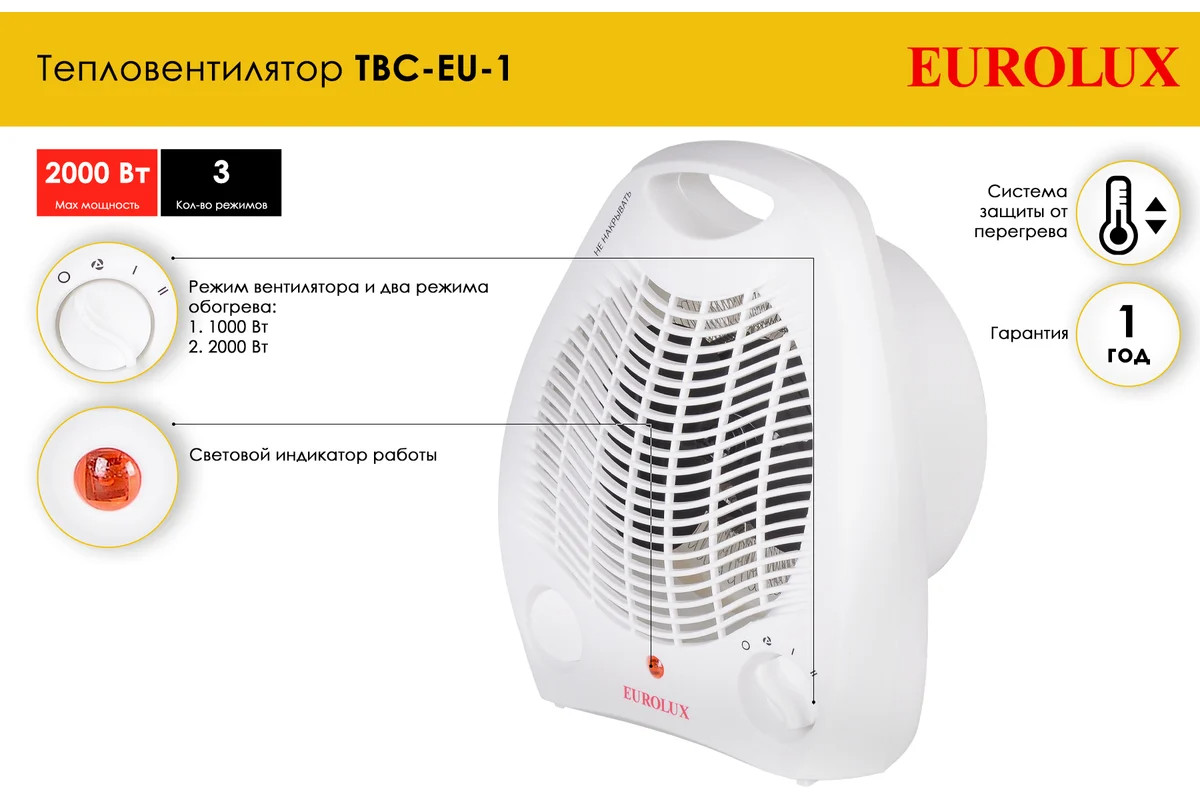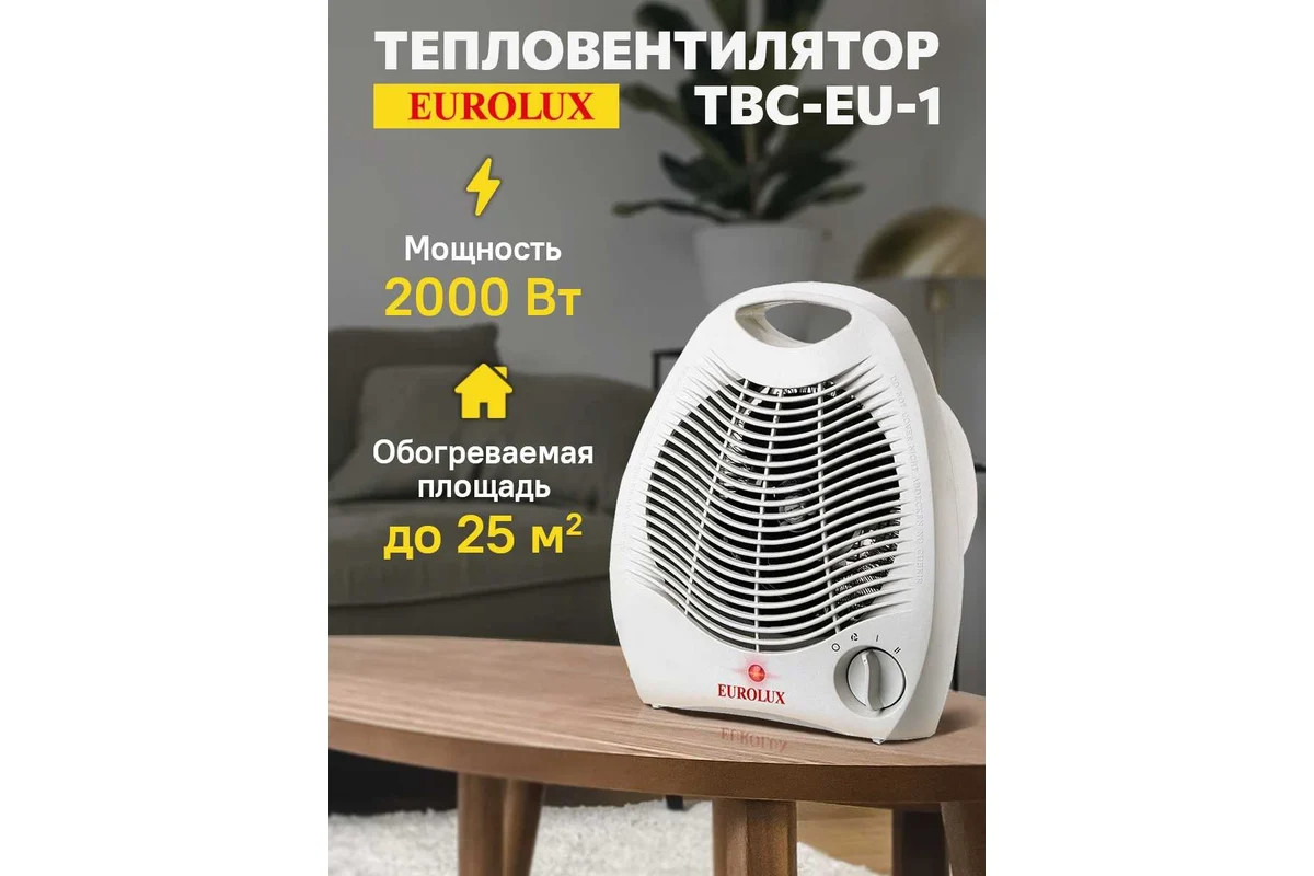 Eurolux TBC-EU-1 – модель электрического тепловентилятора мощностью 2000 Вт, с термозащитой, световой индикацией работы, терморегулятором, предназначенная для обогрева и вентилирования воздуха в помещениях площадью до 25 кв. м.