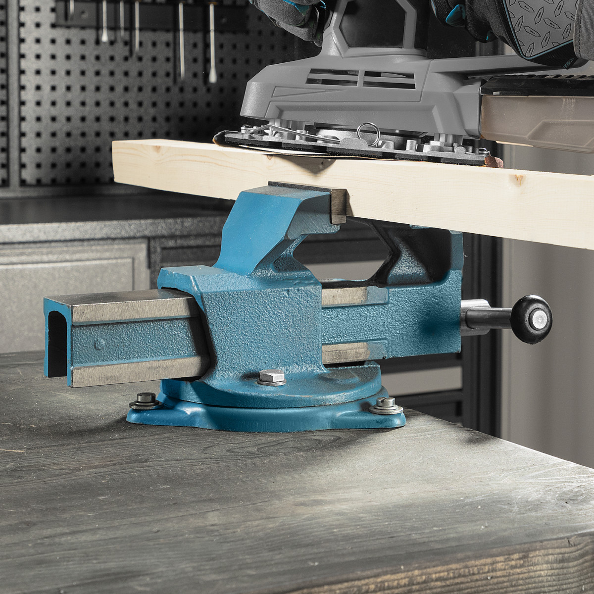 Слесарные тиски 18663, ширина губок 100 мм, с креплением для стола и винтовым зажимом, используются для надежной фиксации заготовок. С их помощью удобно выполнять непрофессиональные столярные и слесарные работы. Тиски с рабочим ходом 140 мм рассчитаны на удержание крупных заготовок.