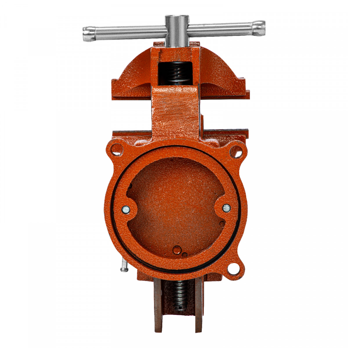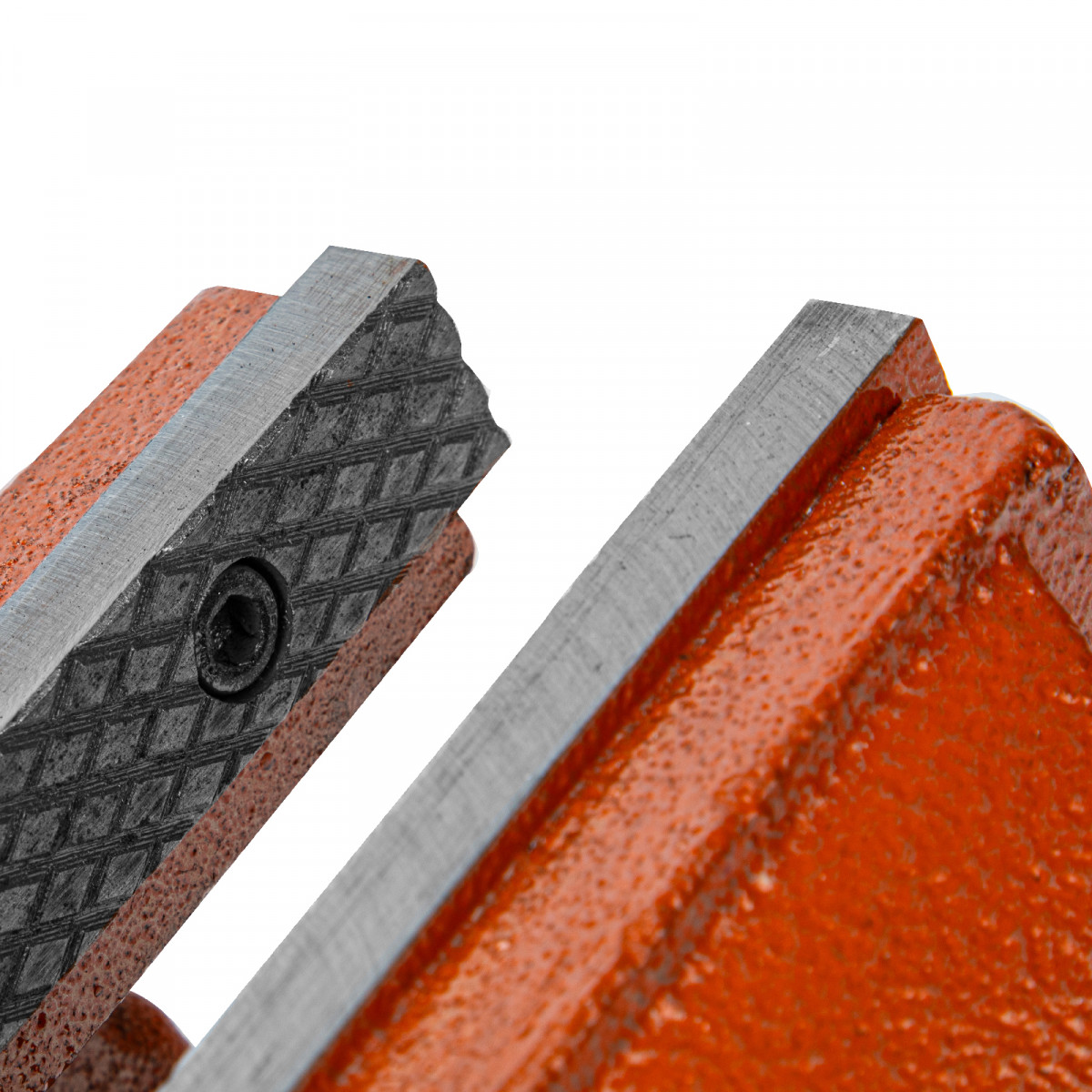 - Корпус тисков выполнен из чугуна, а губки — из стали, благодаря чему достигается высокая прочность инструмента.