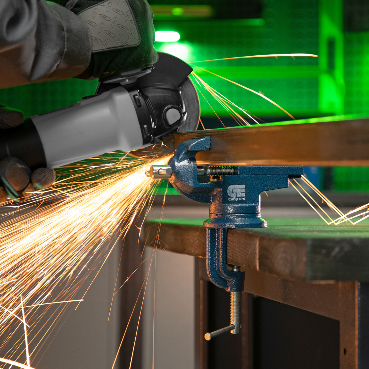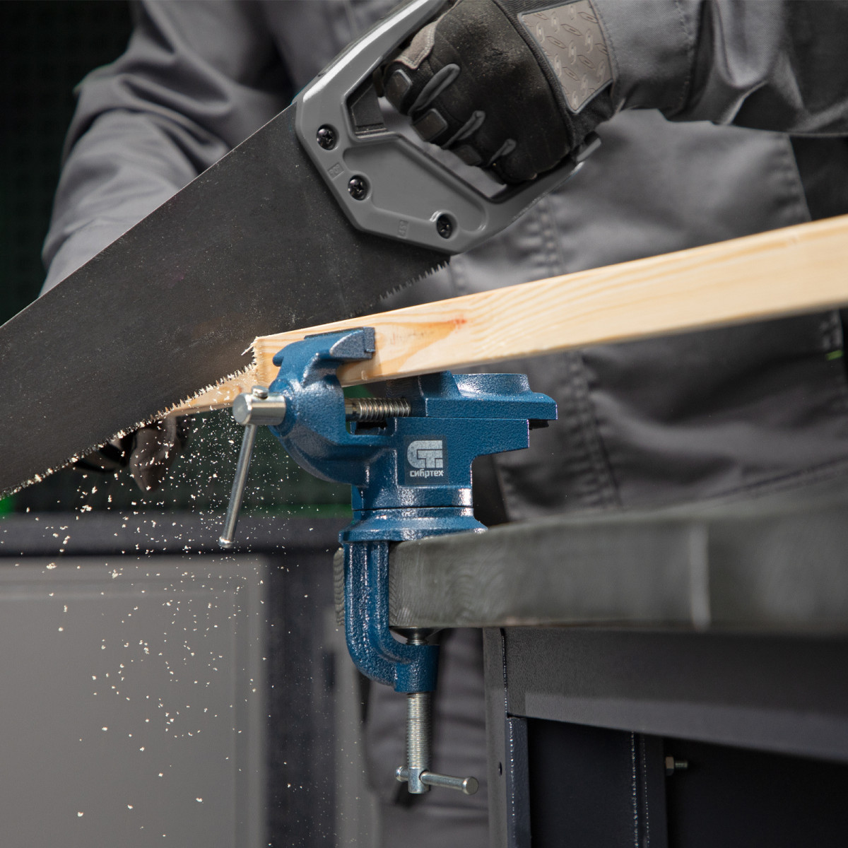 • Винтовой зажим позволяет быстро устанавливать и снимать тиски, поэтому их можно использовать на различных рабочих местах.