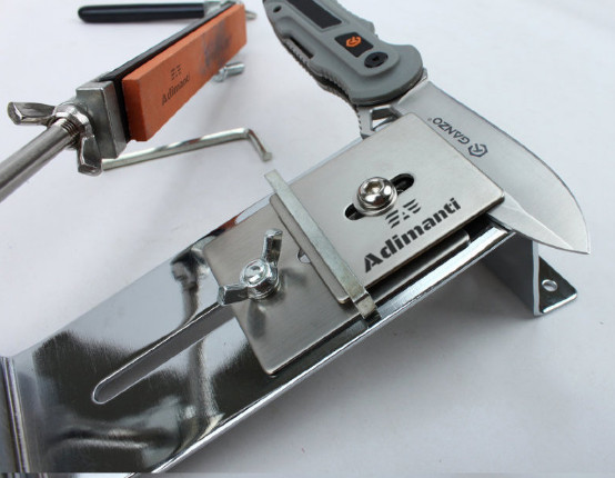 В отличие от других точилок Adimanti, модель Adimanti Touch Pro Steel — полностью металлическая, что повышает ее прочность и долговечность. Помимо того, во время затачивания, клинок можно зафиксировать в нужном положении при помощи стальной направляющей пластины. Эта особенность гарантирует полную безопасность для пользователя во время затачивания ножа, но и накладывает определенные ограничения. Металлические детали могут оставить мелкие царапины на поверхности ножа. Поэтому перед заточкой рекомендуется наклеить на клинок с обеих сторон малярную ленту, изоленту или любое другое защитное покрытие, которое сможет защитить лезвие от прямого контакта с металлом направляющей пластины и основания.